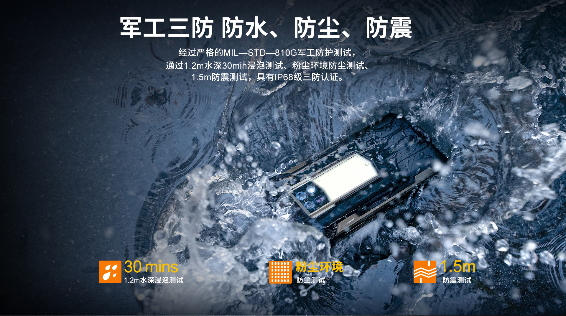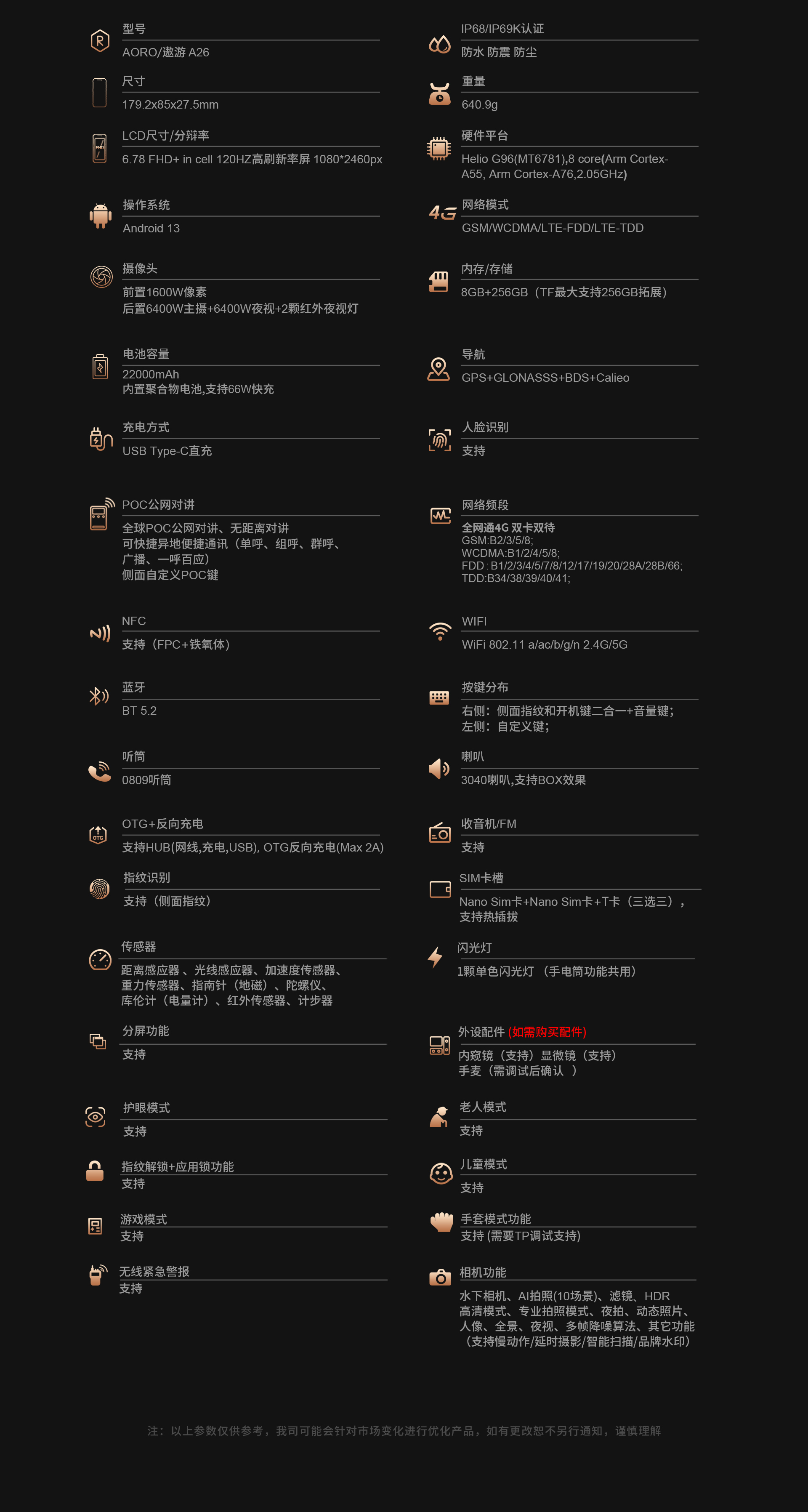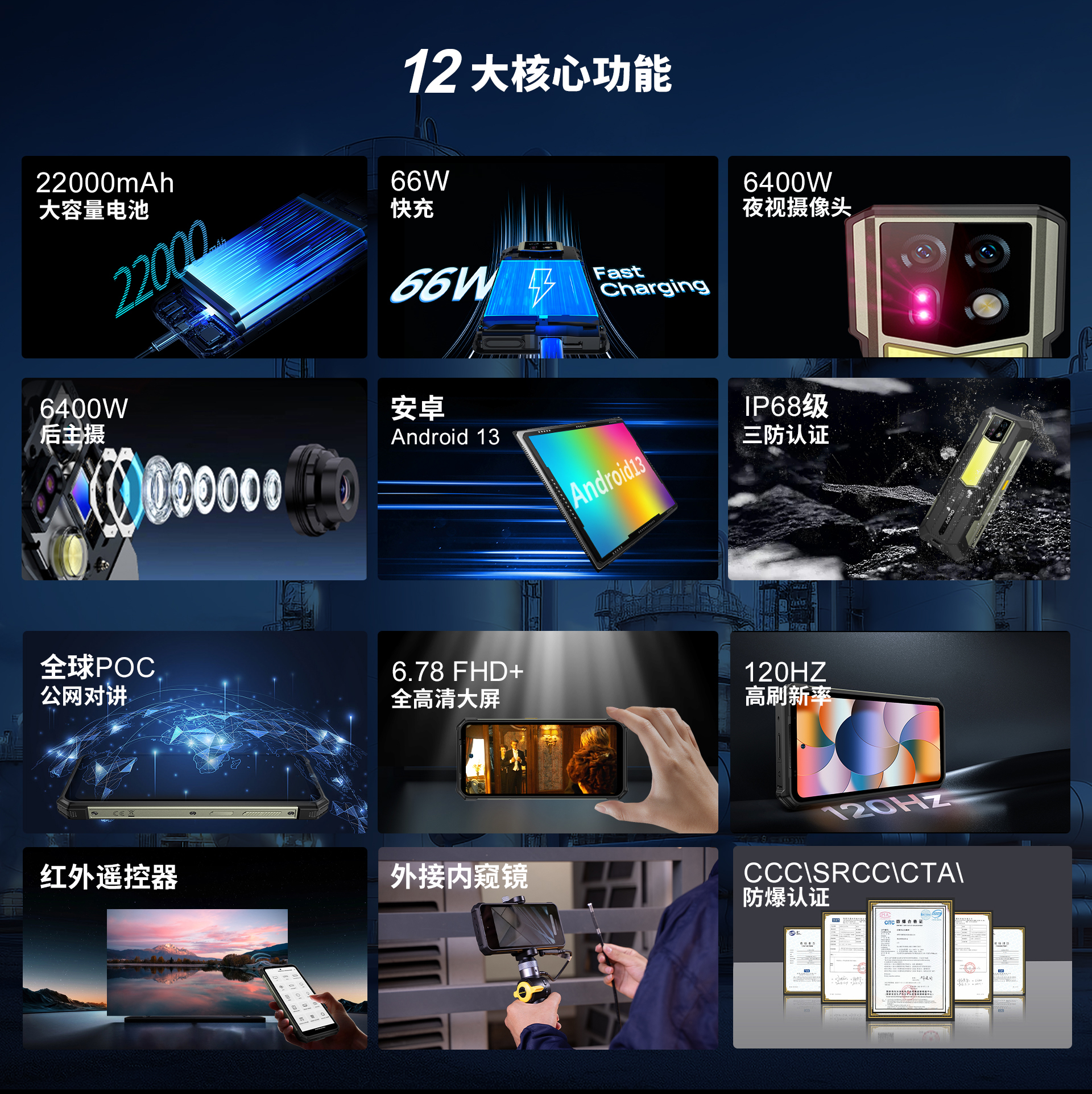 | Helio G96(MT6781) 2.05GHz 八核 | 机身内存 8GB RAM+256GB ROM | 扩展内存支持(256GB) 超长待机 | 聚合物电池22000mAh大电池 支持66W快充 | 前摄1600W | 后置 6400W像素+6400W红外夜视 | 2颗红外夜视灯 | 指纹+人脸识别双解锁 | IP68/IP69K三防认证 | 红外遥控 | NFC | OTG反向充电 | 多功能露营灯