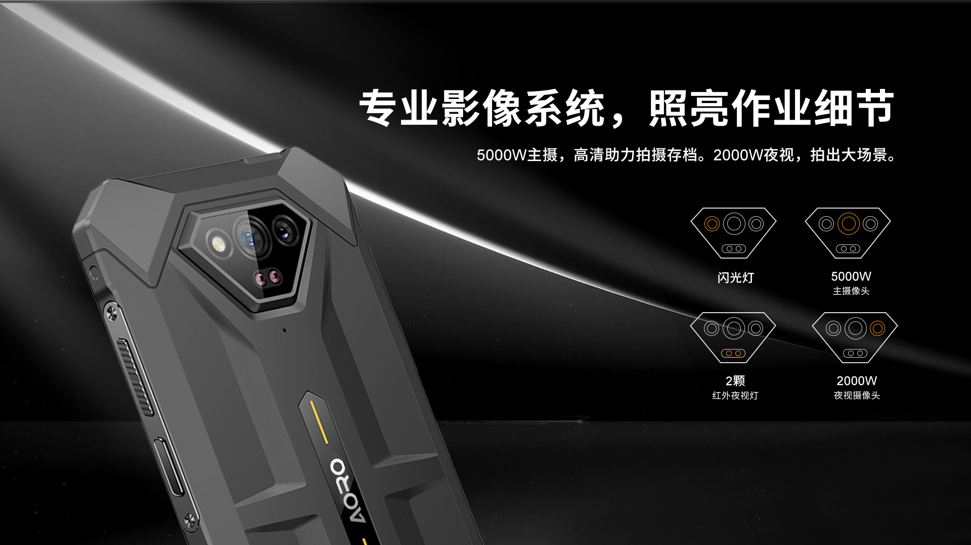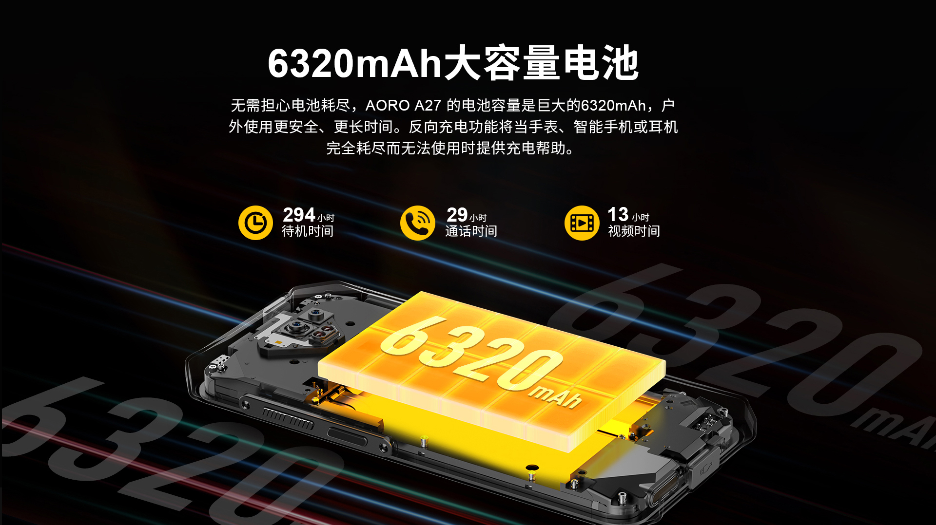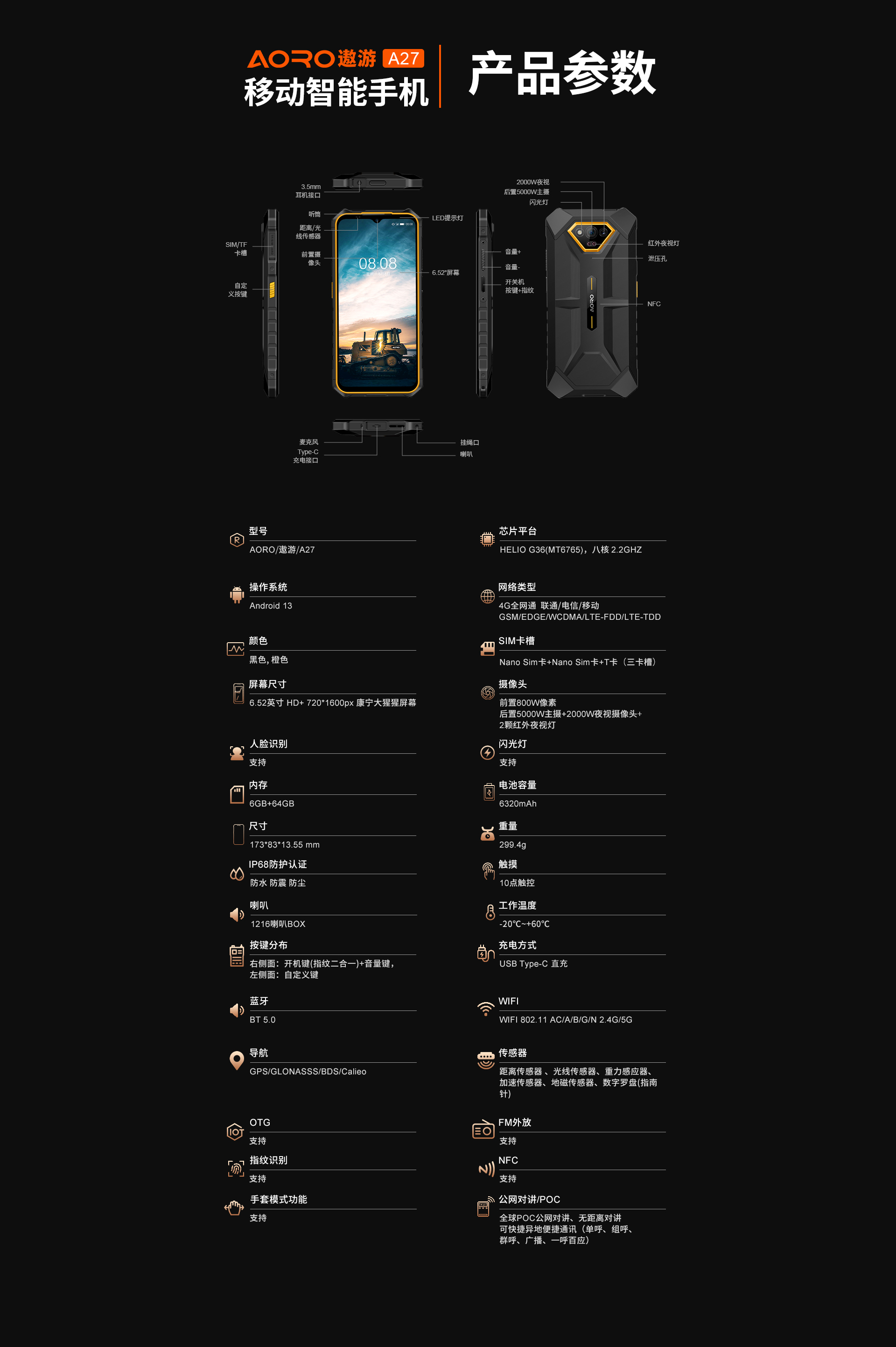 6.52 HD+ 720*1600 10点触控 | MT6765 八核 2.2GH | 机身内存 6GB RAM+64GB ROM | 聚合物锂离子电池6320mAh 超长待机 | 前置800万 后置5000W主摄+2000W夜视+2颗红外夜视灯 | IP68防水|防震|防尘 | NFC | OTG功能 | 四模定位导航 | 指纹识别 | 蓝牙5.0