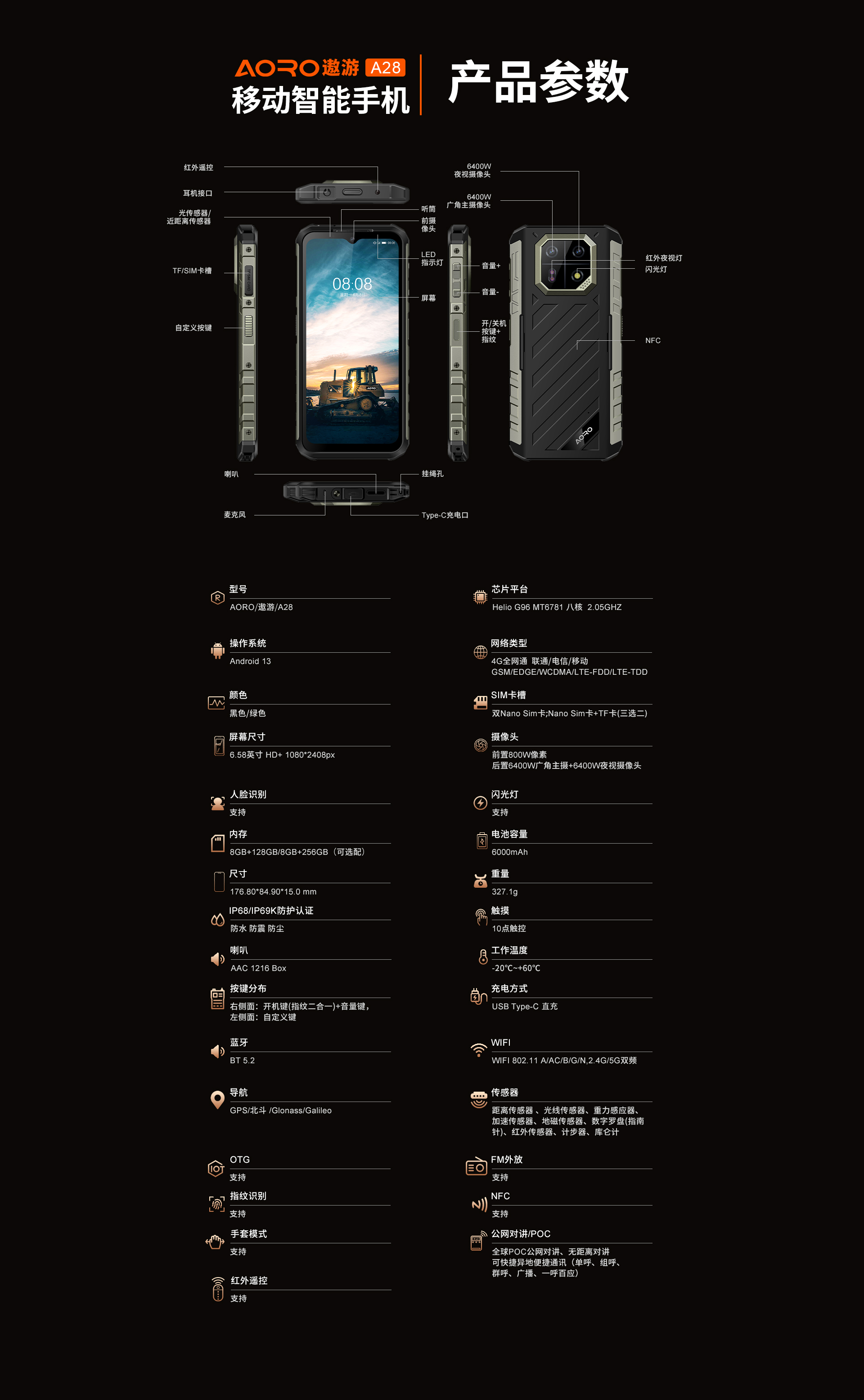 POC公网对讲 | 4G全网通|电信4G|移动4G|联通4G | 双卡双待 | Android 13系统 | 屏幕英寸 6.58 FHD+ 1080*2408 10点触控 | Helio G96 MT6781 八核 2.05GHz | 机身内存 8GB RAM+256GB ROM | 聚合物锂离子电池6000mAh 超长待机 | 前置800万 后置6400W广角主摄+6400W夜视摄像头 | IP68/IP69K防水|防震|防尘 | NFC | OTG功能 | 四模定位导航 | 指纹识别 | 蓝牙5.2
