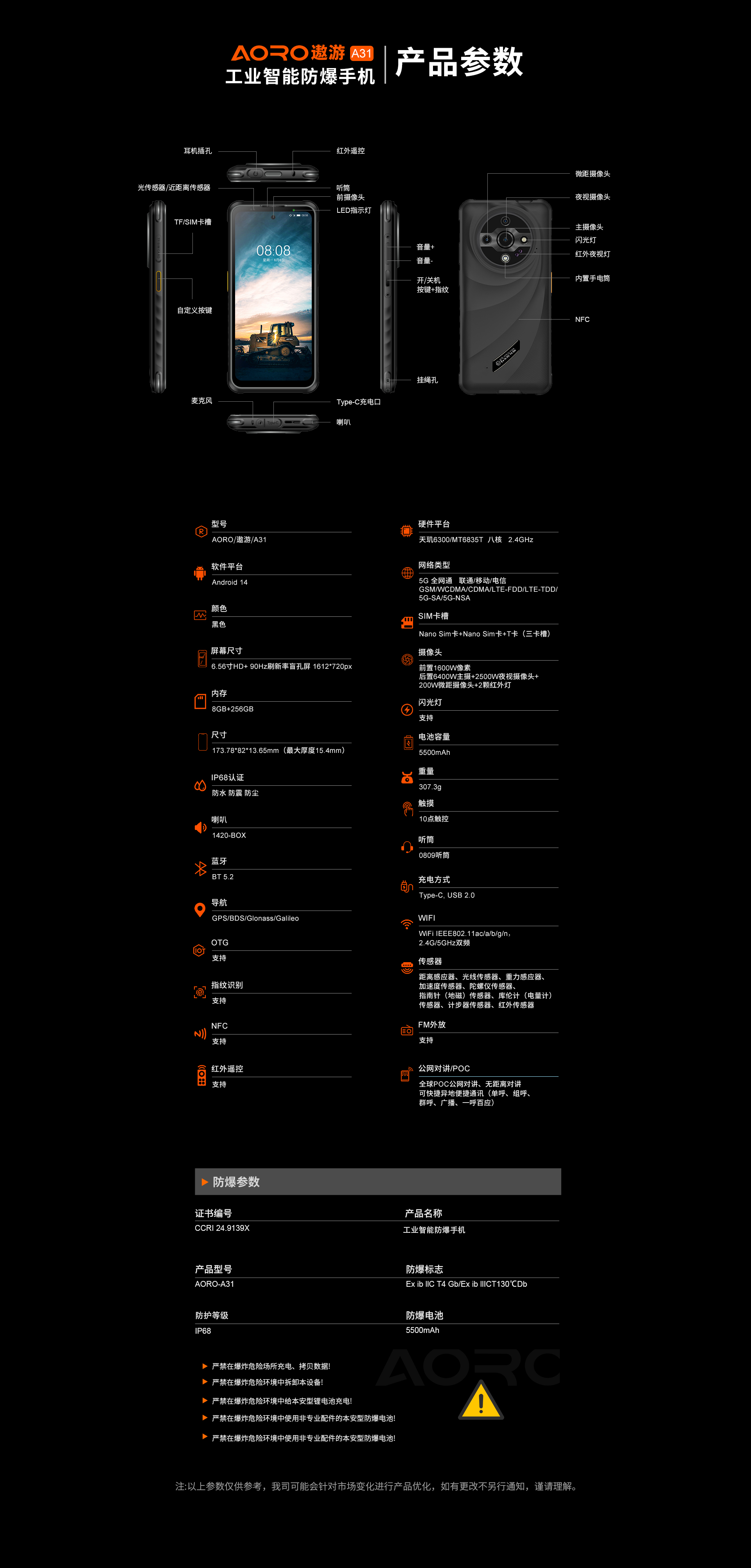5G全网通|电信5G|移动5G|联通5G | 双卡双待 | Android 14系统 | 屏幕英寸 6.56 HD+ 1612*720 90HZ高刷屏 | 天玑6300/MT6835T 八核 2.4GH | 机身内存8GB RAM+256GB ROM TF最大支持1TB拓展 | 聚合物锂离子电池5500mAh 超长待机 | 前置1600万 后置6400W主摄+FLIR 2500W夜视+200W微距+2颗红外灯 | IP68/IP69K防水|防震|防尘 | NFC | OTG功能 | 四模定位导航 | 红外遥控 | 指纹识别 | 蓝牙5.2 | 3.5mm耳机孔