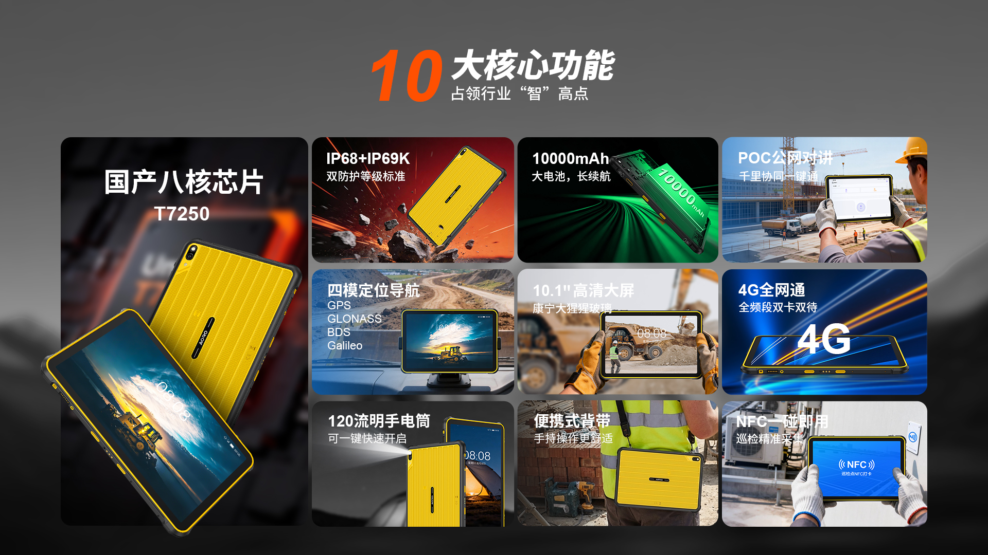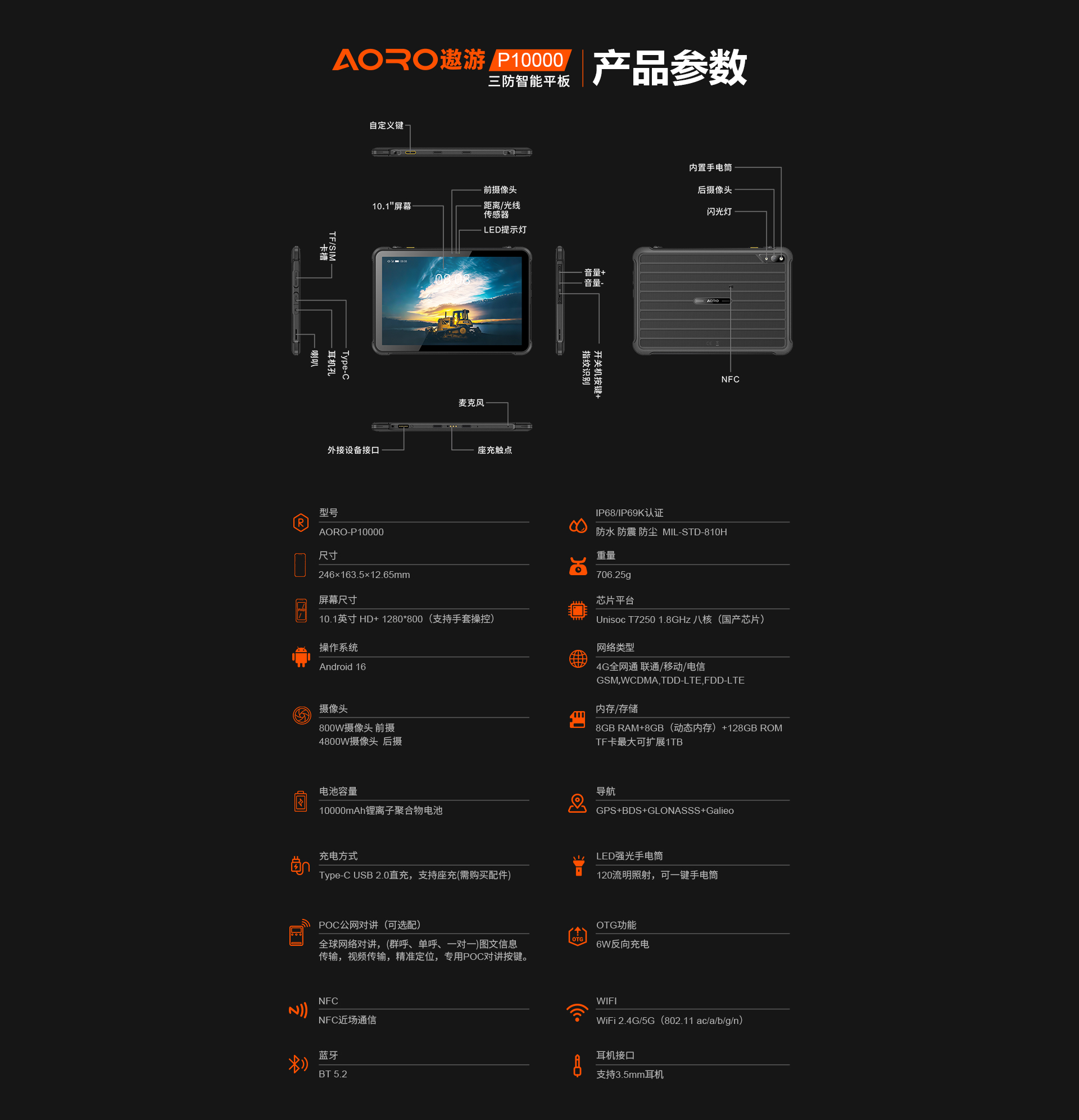 POC公网一键全球对讲 | 4G全网通|电信4G|移动4G|联通4G | 双卡双待 三卡槽(支持热插拔) | Android 16系统 | 屏幕10.1英寸 HD+ 1280*800 康宁大猩猩玻璃 | 展锐T7250 1.8GHz 八核 国产芯片 | 机身内存 8GB RAM(8GB动态内存)+128GB ROM | 扩展内存支持(1TB) | 聚合物锂离子电池10000mAh 超续航、长待机| 前摄800万 后摄4800万 | IP68/IP69K双重防护等级 防水|防震|防尘 | NFC | OTG功能 | 支持内窥镜 | 内置手电筒(120流明,一键手电筒)| 蓝牙5.2 | 四模定位GPS+GLONASSS+BDS+Calieo