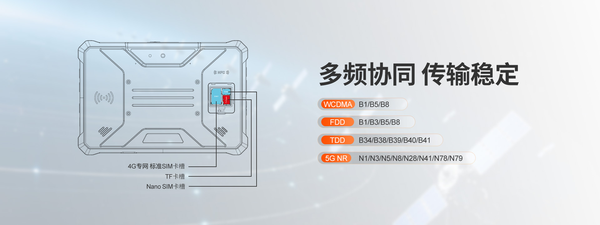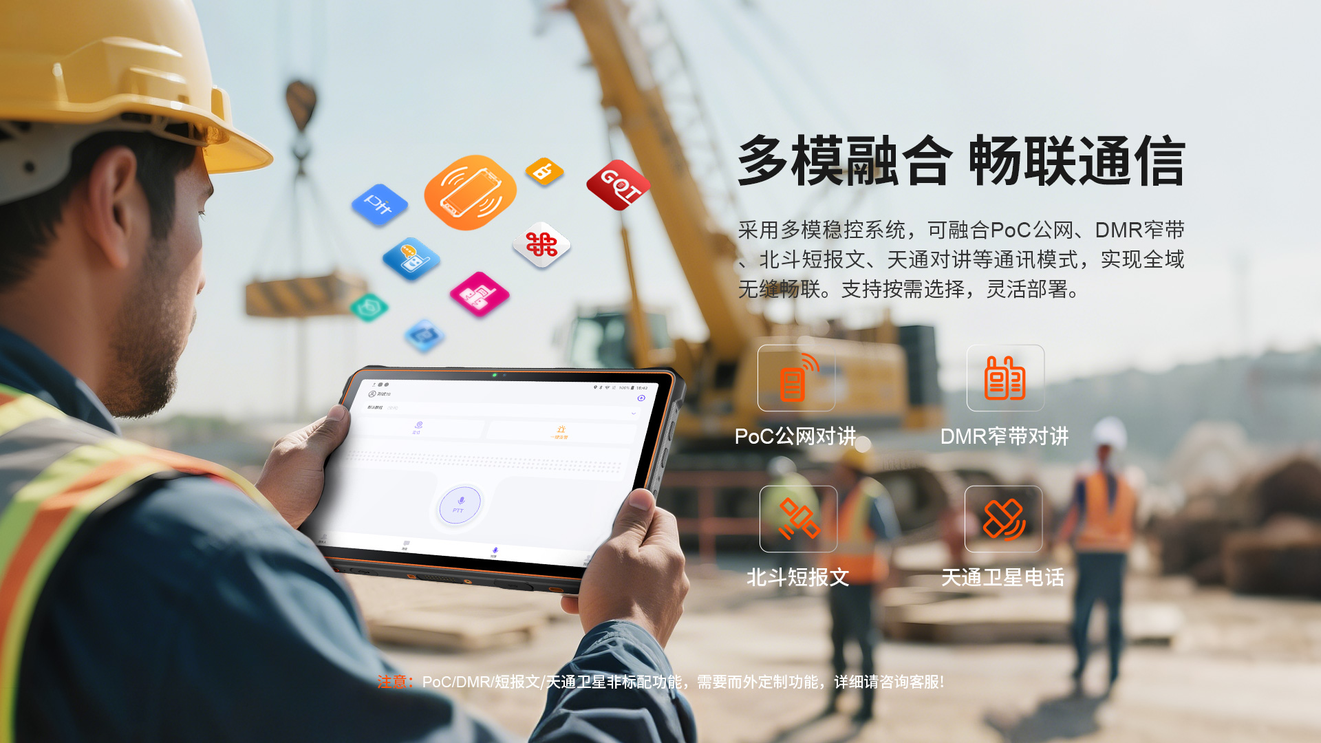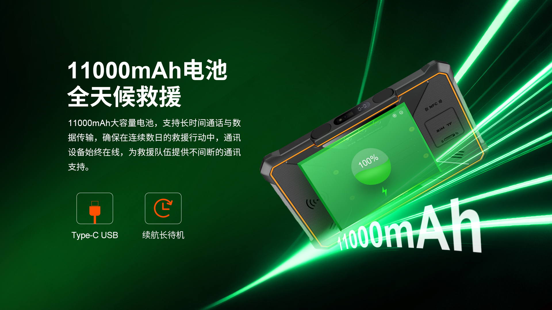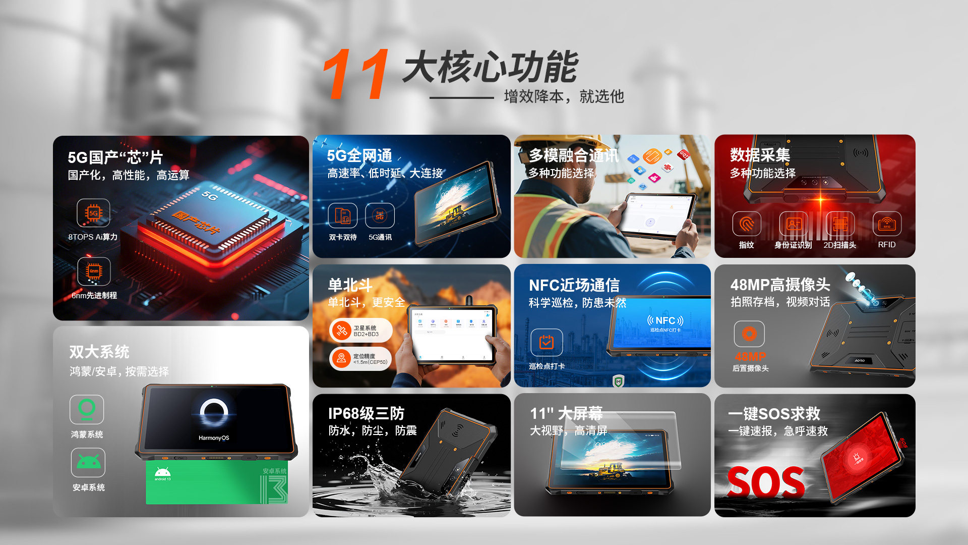 数据采集多模融合通讯智能终端 | 5G全网通 | 双卡双待 | Android 13/鸿蒙系统(二选一) | 屏幕英寸 11 IPS 1200*1920 | 5G展锐UIS7885 2.7GHz 八核 | 机身内存 8GB RAM+256GB ROM | 聚合物锂离子电池11000mAh 超长待机 | 前置3200万 后置4800万+800W广角+1300W红外夜视 | IP68防水|防震|防尘认证 | NFC | OTG功能 | 一键SOS | 座充 | 单北斗、2D扫描头、RTK高精度定位、天通卫星电话、北斗短报文(选配)