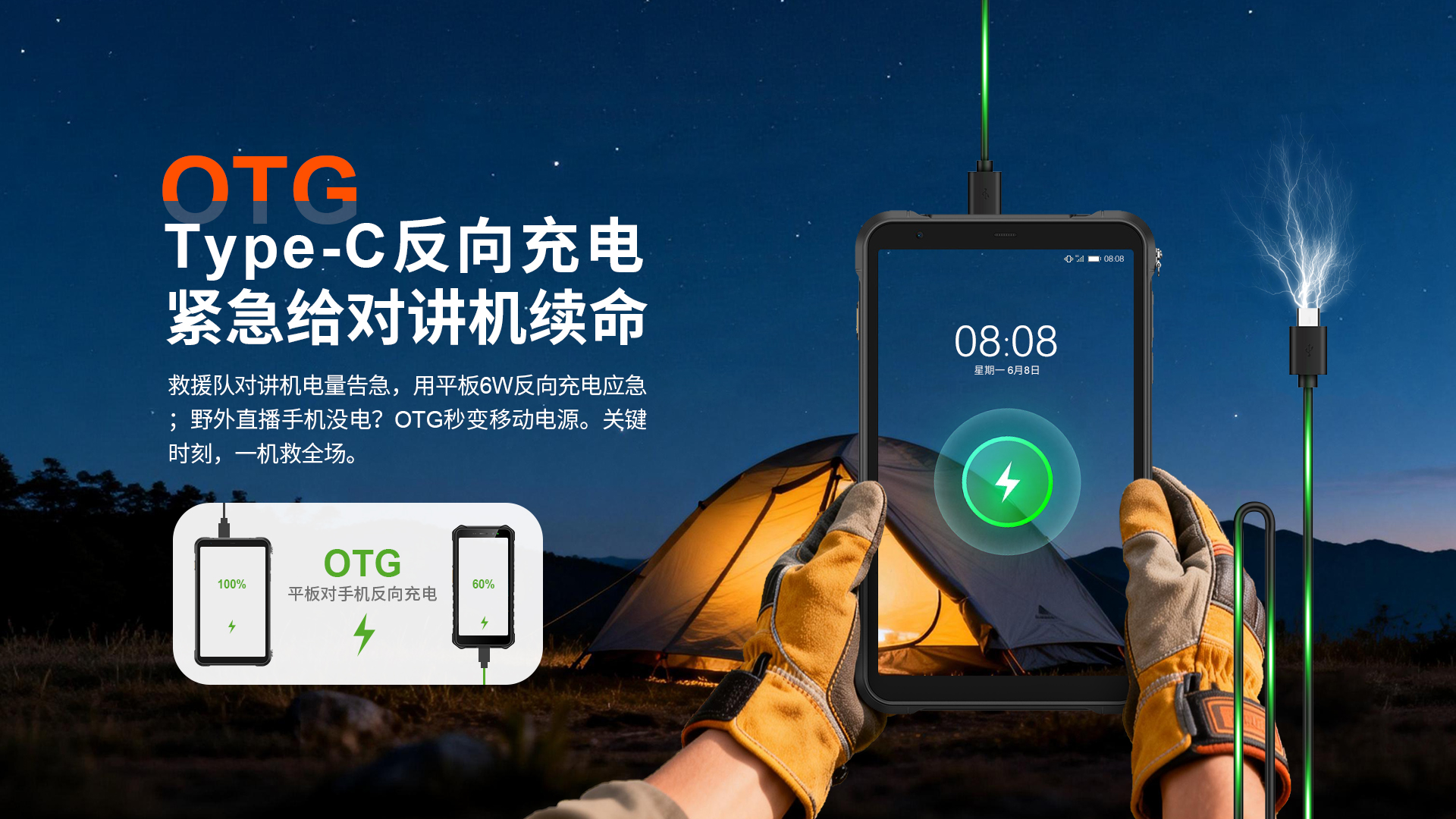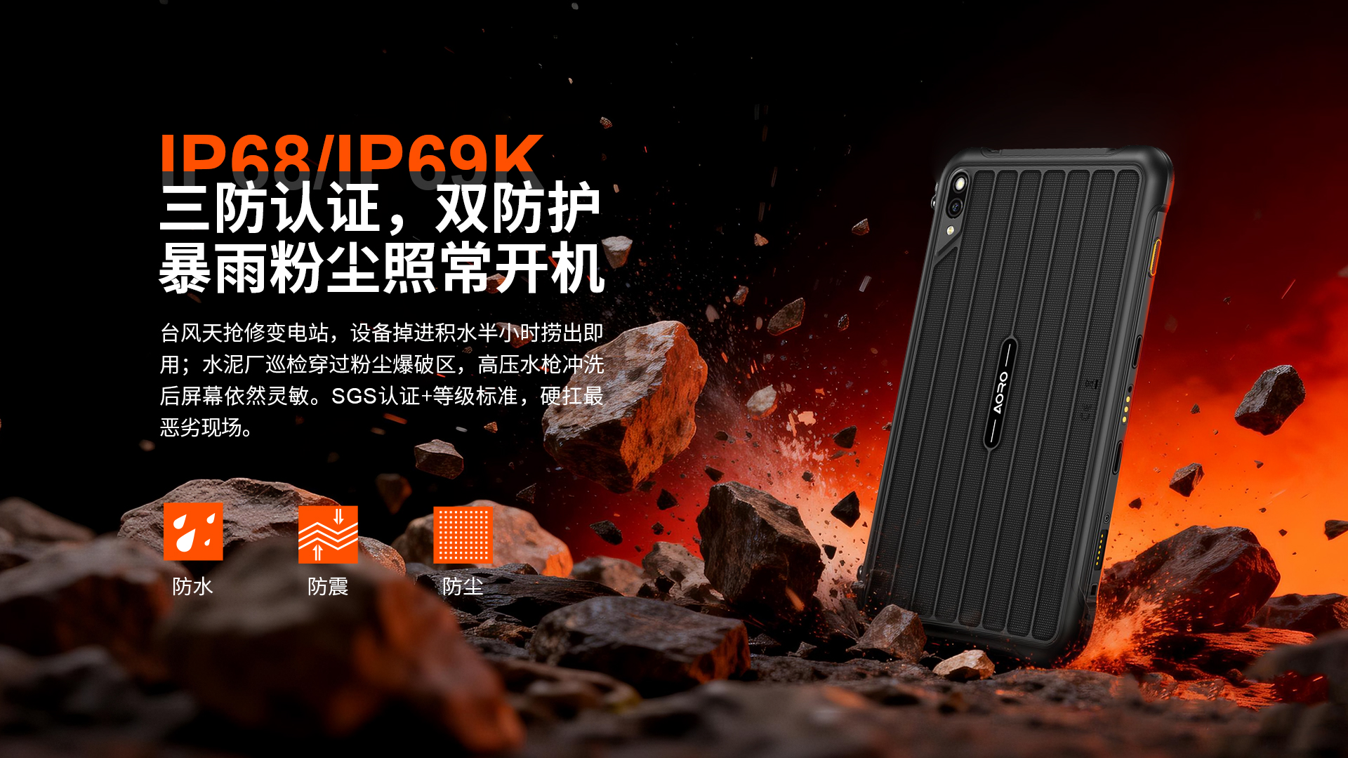 POC公网一键全球对讲 | 4G全网通|电信4G|移动4G|联通4G | 双卡双待 三卡槽(支持热插拔) | Android 16系统 | 屏幕8.68英寸 HD+ 1340*800 | 展锐T7250 1.8GHz 八核 国产芯片 | 机身内存 8GB RAM(8GB动态内存)+128GB ROM | 扩展内存支持(1TB) | 聚合物锂离子电池7000mAh 超长待机 | 前摄800万 后摄1600万 | IP68/IP69K双重防护等级 防水|防震|防尘 | NFC | OTG功能 | 支持内窥镜 | Mini手电筒(133流明,一键手电筒)| 蓝牙5.2 | 四模定位GPS+GLONASSS+BDS+Calieo