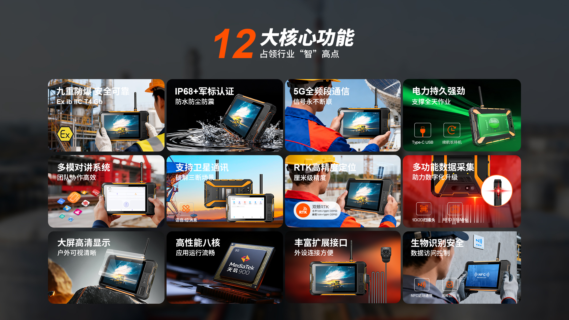 数据采集多模融合通讯智能终端 | 5G全网通 | 双卡双待 | Android 12系统 | 屏幕英寸 8英寸 FHD 1200*1920 | MT6877(天玑900) 2.4GHz 八核 | 机身内存 8GB RAM+256GB ROM | 聚合物锂离子电池8000mAh 超长待机 | 前置800万 后置4800万 | IP68防水|防震|防尘认证 | NFC | OTG功能 | DMR窄带对讲、POC公网对讲、PDT集群对讲、单北斗、2D扫描头、RTK高精度定位、天通卫星电话、北斗短报文(多功能可选配)
