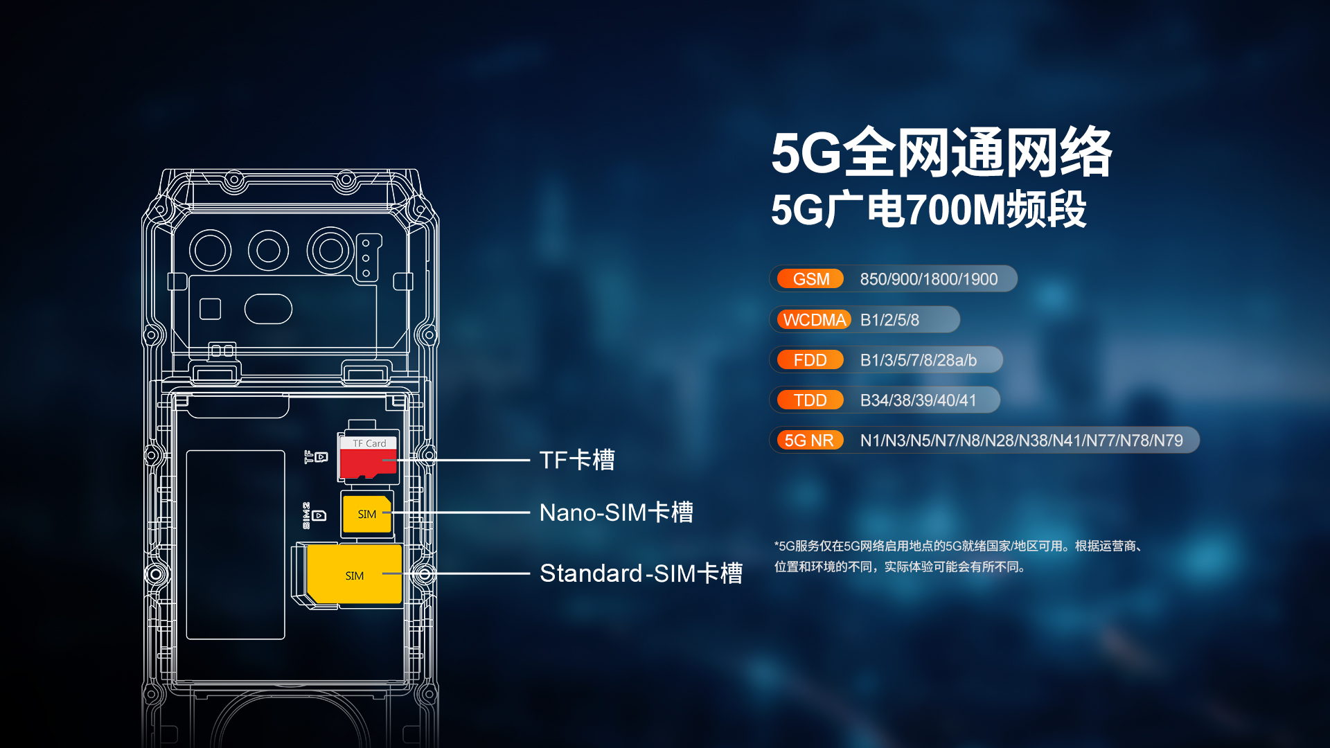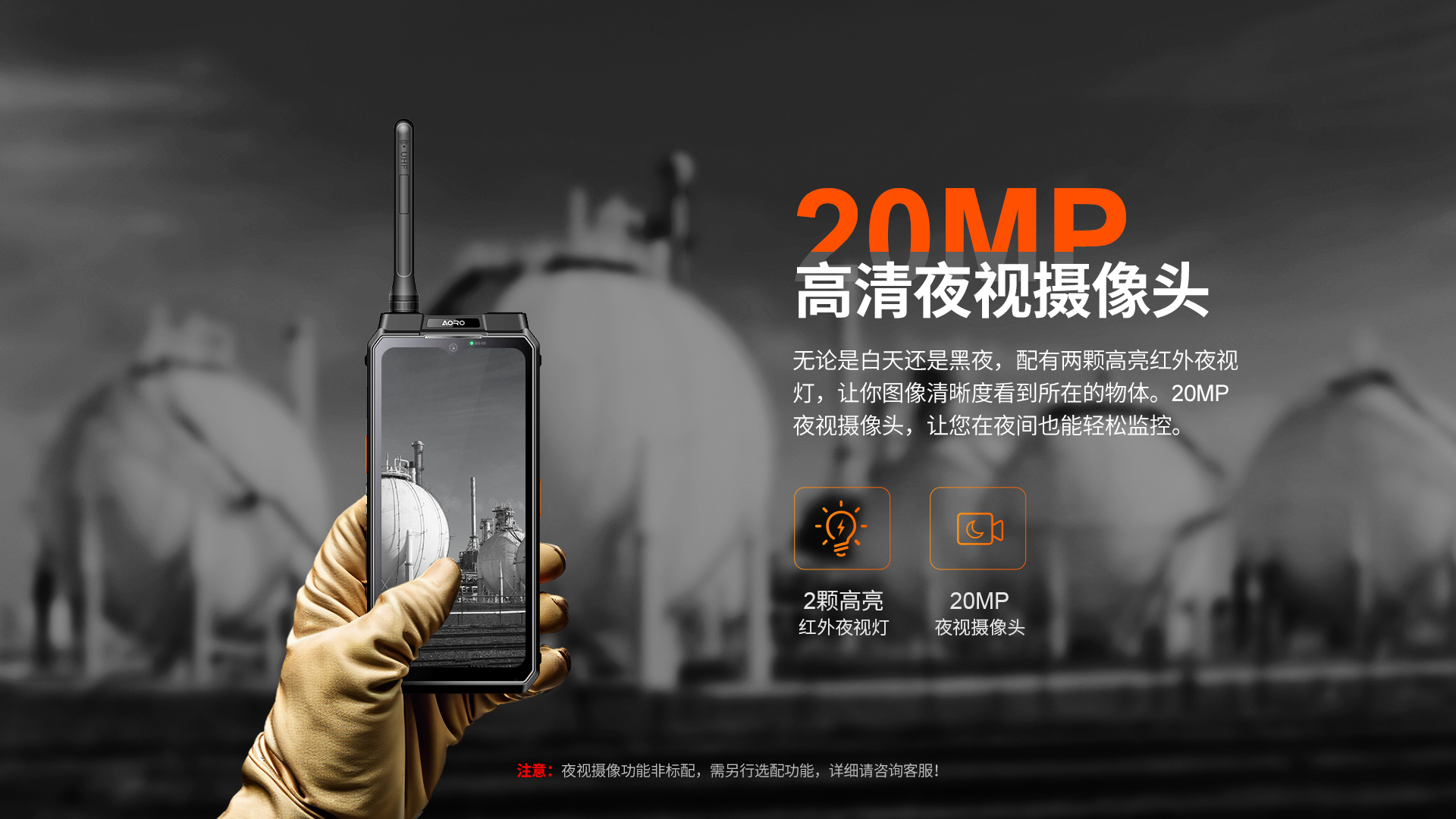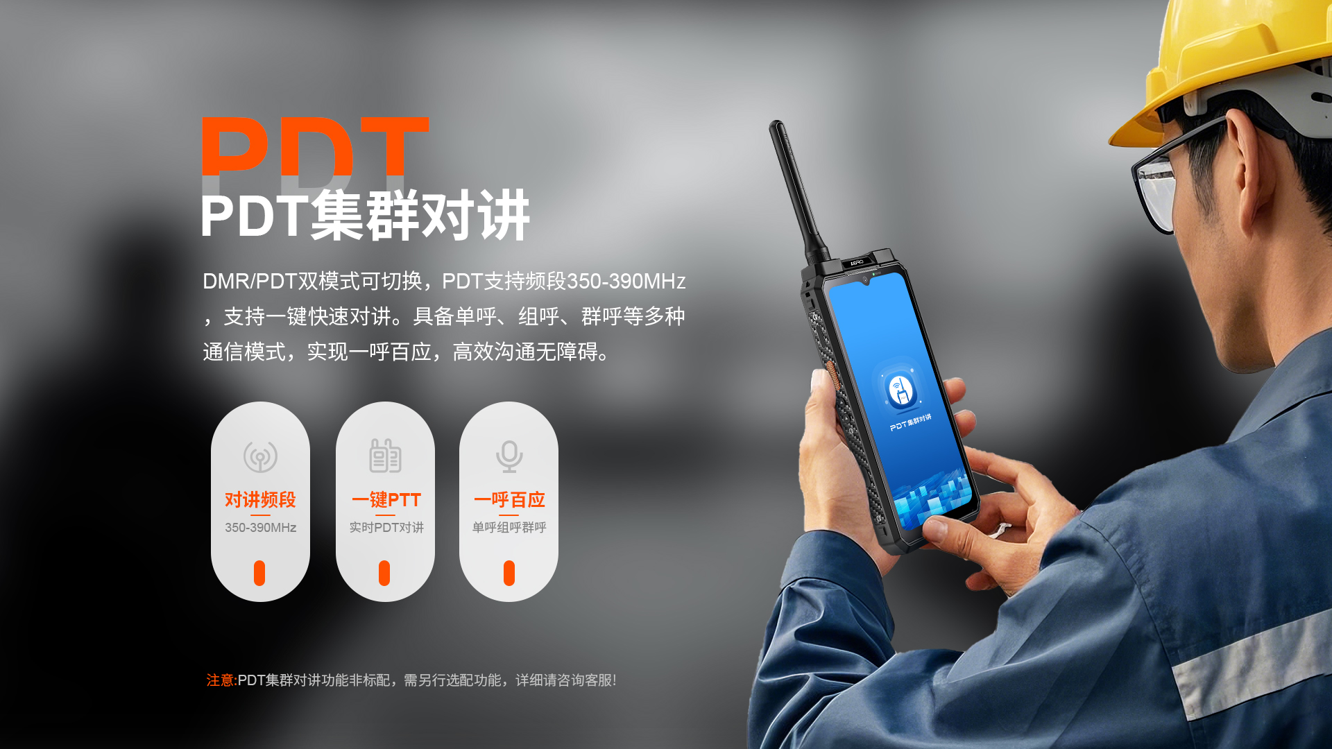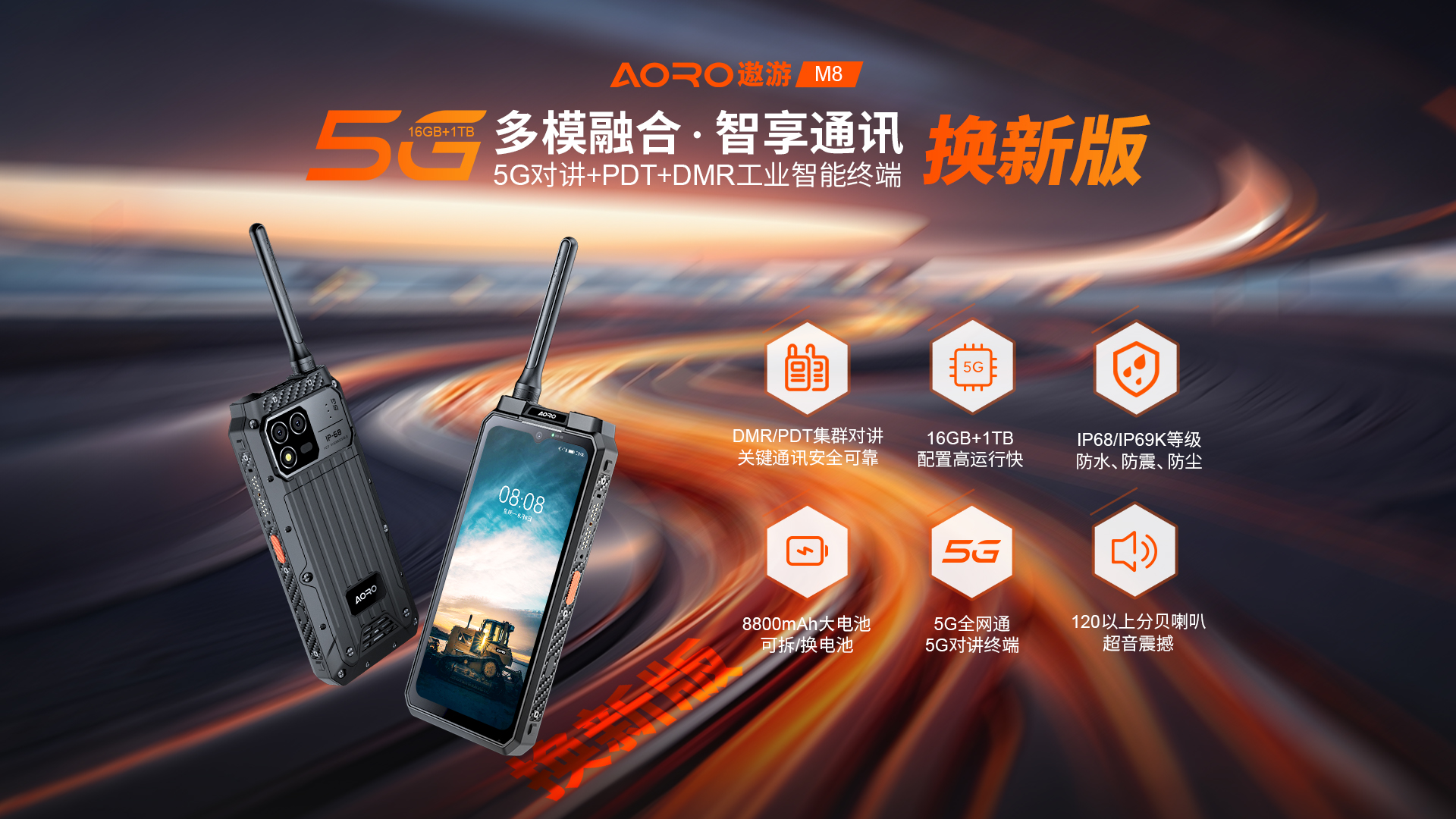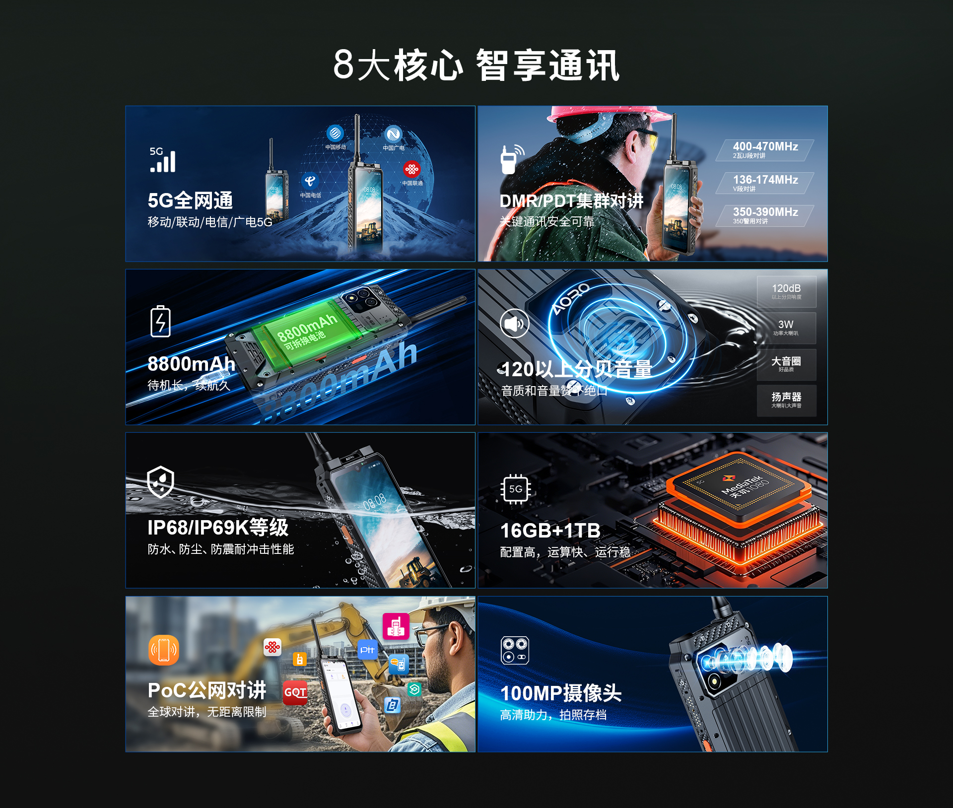 5G对讲+DMR/PDT集群对讲+PoC工业智能手机 | PTT+POC双对讲按键 | 5G全网通|广电5G|电信5G|移动5G|联通5G | 双卡双待 | Android 12系统 | 屏幕英寸 6.583 FHD 1080*2408 | 天玑1080 2.6GHz 八核 | 机身内存 16GB RAM+1TB ROM | 扩展内存支持(2TB) | 聚合物锂离子电池8800mAh(可拆换电池)超长待机 | 前置32MP 后置100MP+500W微距+夜视/热成像(二选一) | IP68/IP69K 防水|防震|防尘认证 1.5米水下浸泡40分钟测试 | NFC | OTG功能 | 前侧面纹识别 | 座充 | 红外热成像/红外夜视(可选配)