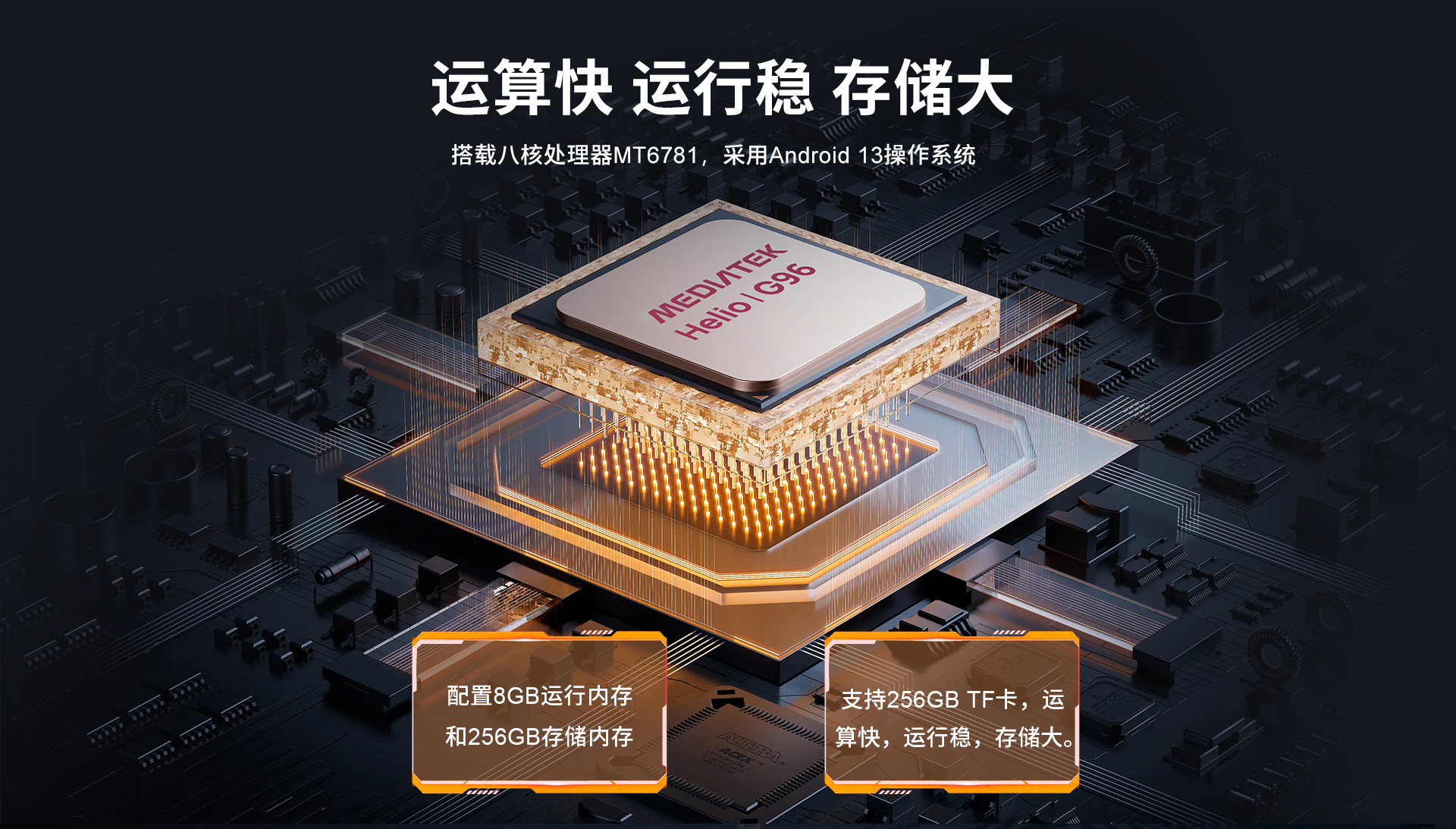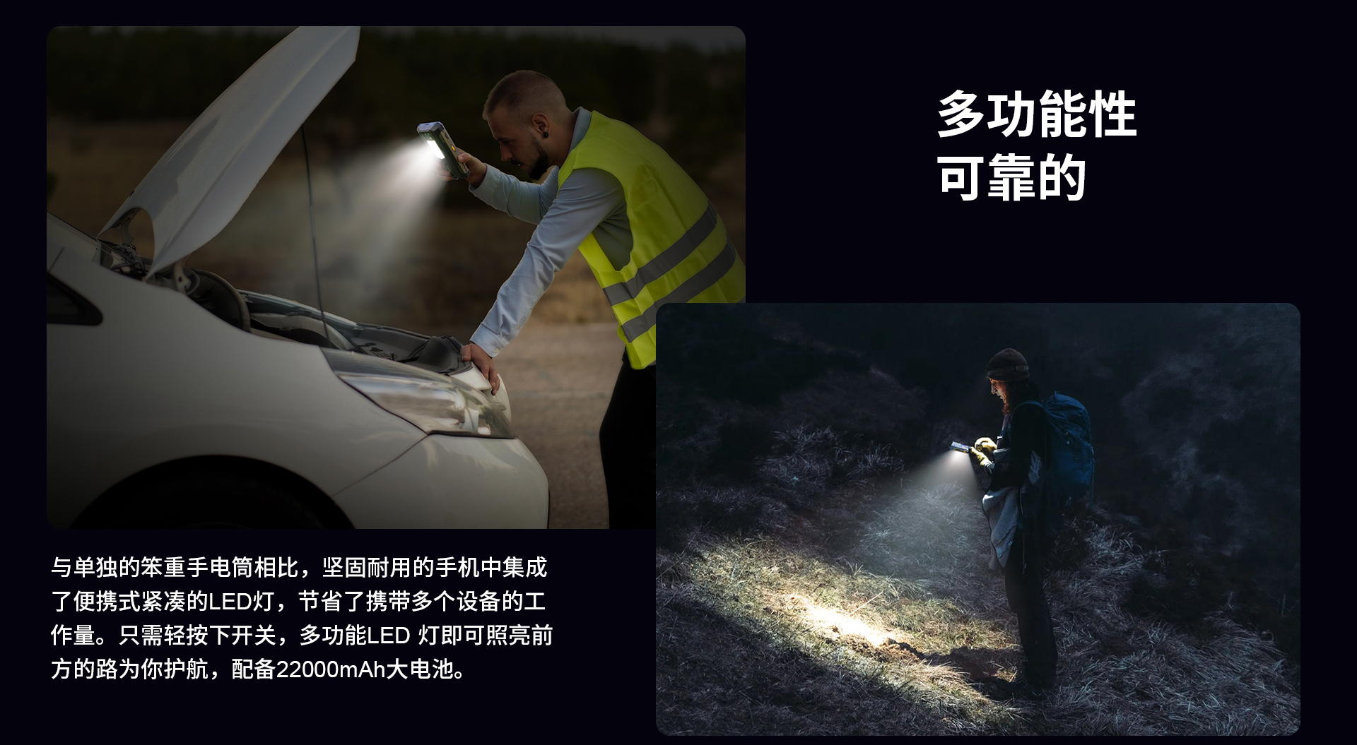 | Helio G96(MT6781) 2.05GHz 八核 | 机身内存 8GB RAM+256GB ROM | 扩展内存支持(256GB) 超长待机 | 聚合物电池22000mAh大电池 支持66W快充 | 前摄1600W | 后置 6400W像素+6400W红外夜视 | 2颗红外夜视灯 | 指纹+人脸识别双解锁 | IP68/IP69K三防认证 | 红外遥控 | NFC | OTG反向充电 | 多功能露营灯