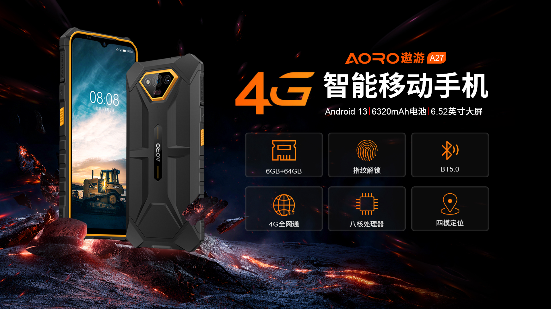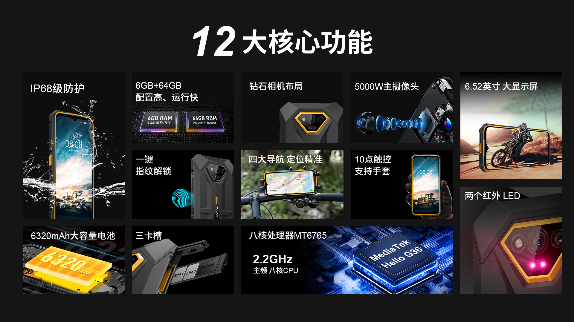 6.52 HD+ 720*1600 10点触控 | MT6765 八核 2.2GH | 机身内存 6GB RAM+64GB ROM | 聚合物锂离子电池6320mAh 超长待机 | 前置800万 后置5000W主摄+2000W夜视+2颗红外夜视灯 | IP68防水|防震|防尘 | NFC | OTG功能 | 四模定位导航 | 指纹识别 | 蓝牙5.0