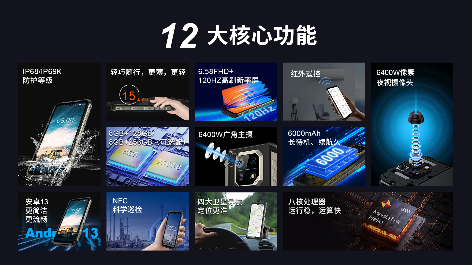 POC公网对讲 | 4G全网通|电信4G|移动4G|联通4G | 双卡双待 | Android 13系统 | 屏幕英寸 6.58 FHD+ 1080*2408 10点触控 | Helio G96 MT6781 八核 2.05GHz | 机身内存 8GB RAM+256GB ROM | 聚合物锂离子电池6000mAh 超长待机 | 前置800万 后置6400W广角主摄+6400W夜视摄像头 | IP68/IP69K防水|防震|防尘 | NFC | OTG功能 | 四模定位导航 | 指纹识别 | 蓝牙5.2