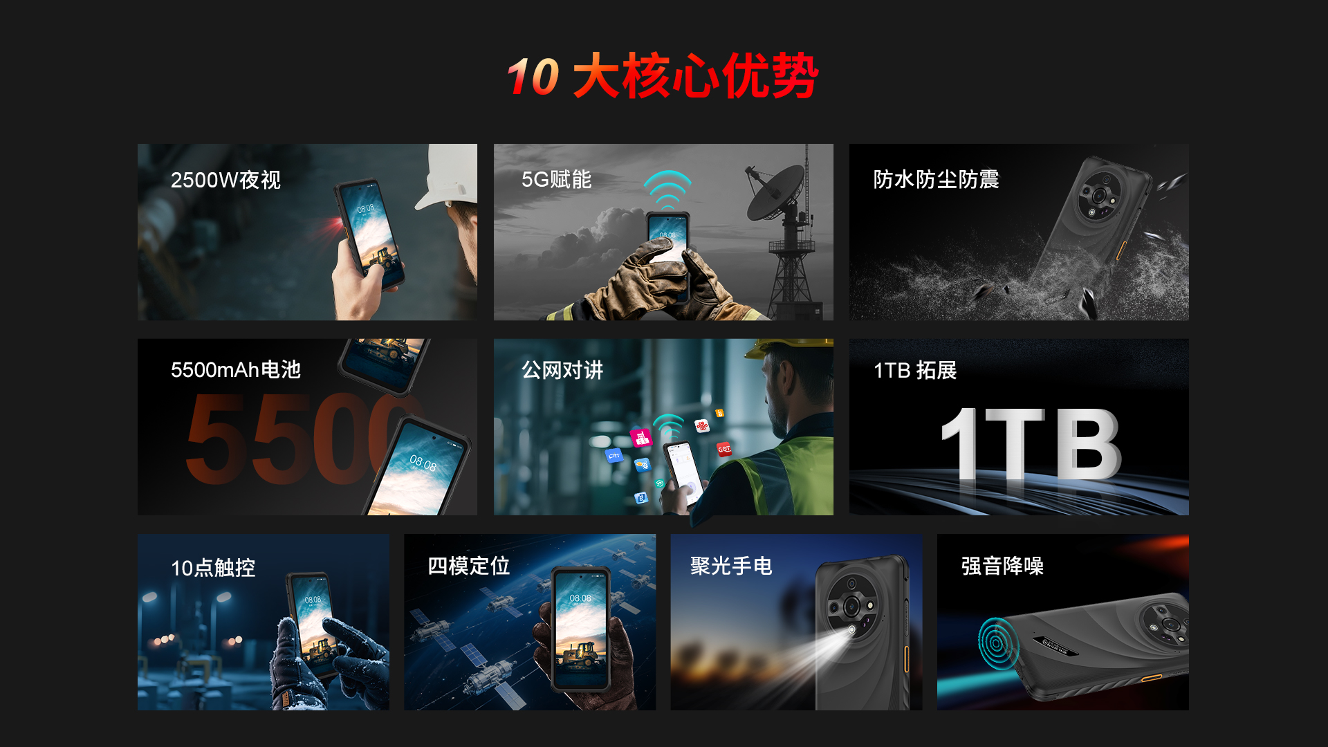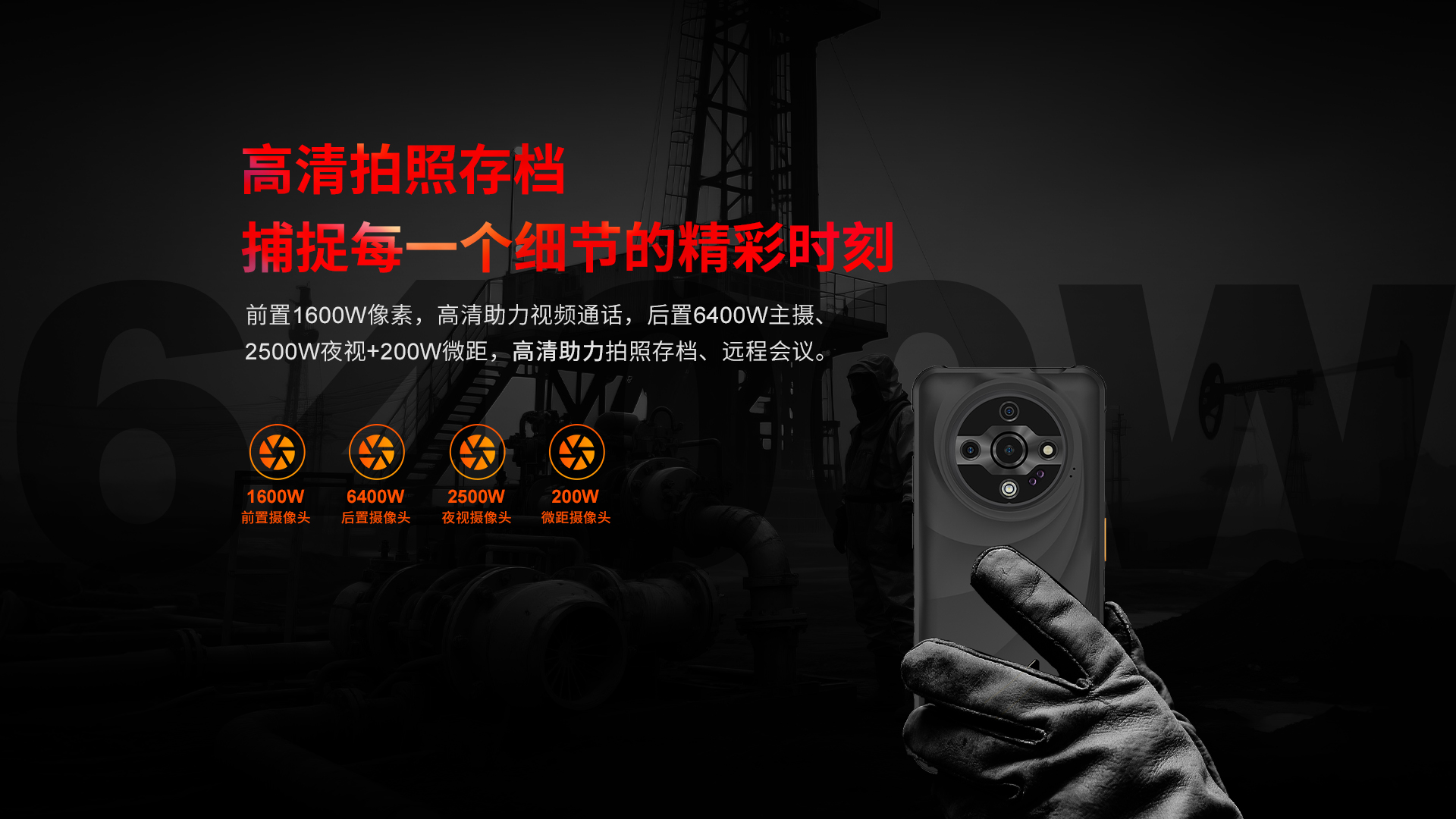 5G全网通|电信5G|移动5G|联通5G | 双卡双待 | Android 14系统 | 屏幕英寸 6.56 HD+ 1612*720 90HZ高刷屏 | 天玑6300/MT6835T 八核 2.4GH | 机身内存8GB RAM+256GB ROM TF最大支持1TB拓展 | 聚合物锂离子电池5500mAh 超长待机 | 前置1600万 后置6400W主摄+FLIR 2500W夜视+200W微距+2颗红外灯 | IP68/IP69K防水|防震|防尘 | NFC | OTG功能 | 四模定位导航 | 红外遥控 | 指纹识别 | 蓝牙5.2 | 3.5mm耳机孔