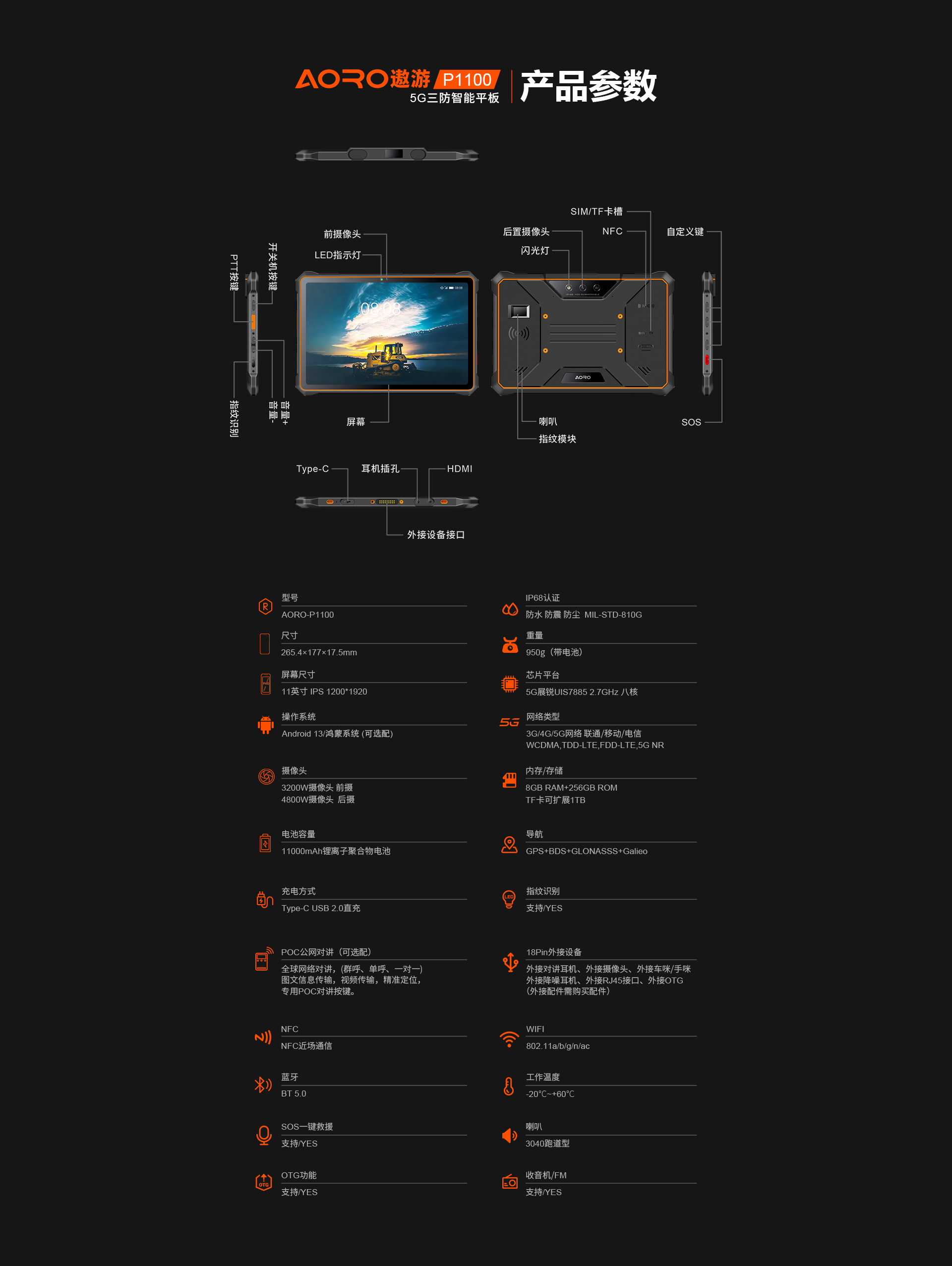 数据采集多模融合通讯智能终端 | 5G全网通 | 双卡双待 | Android 13/鸿蒙系统(二选一) | 屏幕英寸 11 IPS 1200*1920 | 5G展锐UIS7885 2.7GHz 八核 | 机身内存 8GB RAM+256GB ROM | 聚合物锂离子电池11000mAh 超长待机 | 前置3200万 后置4800万+800W广角+1300W红外夜视 | IP68防水|防震|防尘认证 | NFC | OTG功能 | 一键SOS | 座充 | 单北斗、2D扫描头、RTK高精度定位、天通卫星电话、北斗短报文(选配)