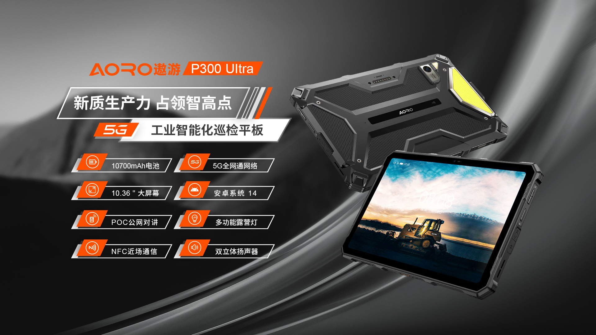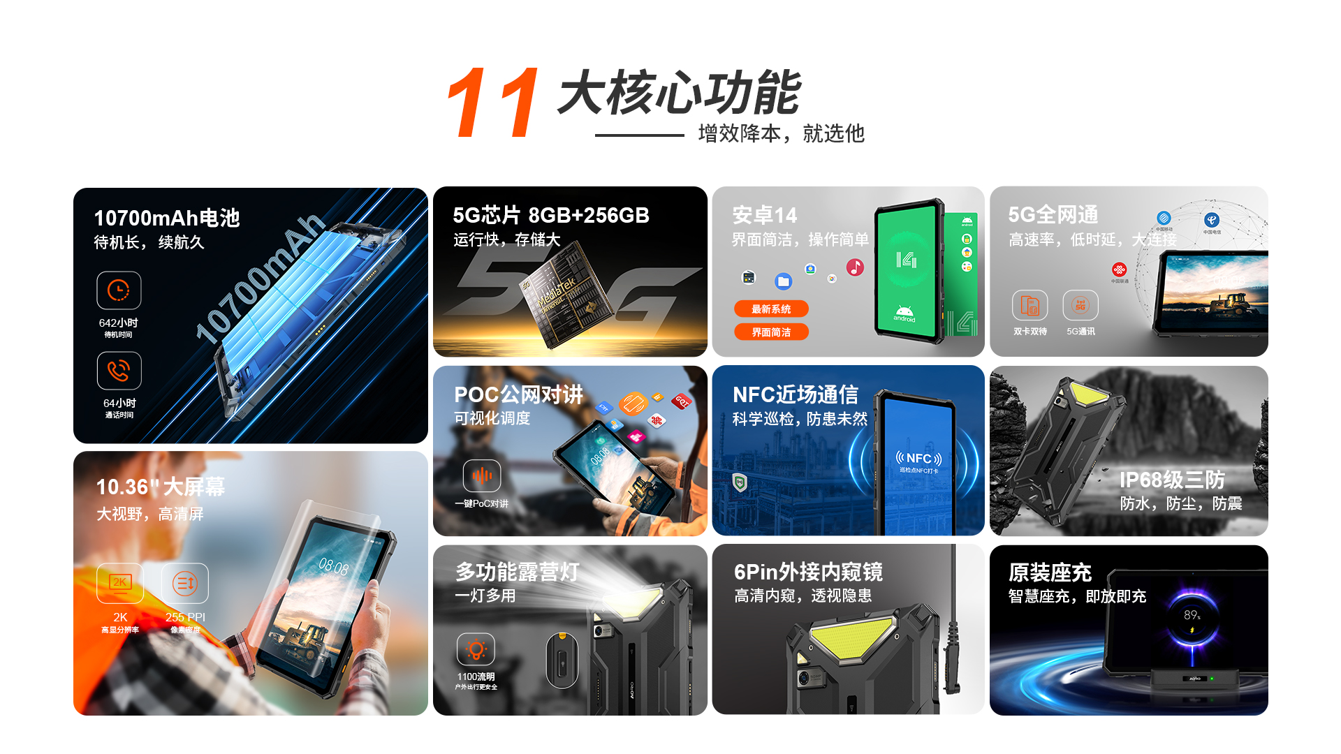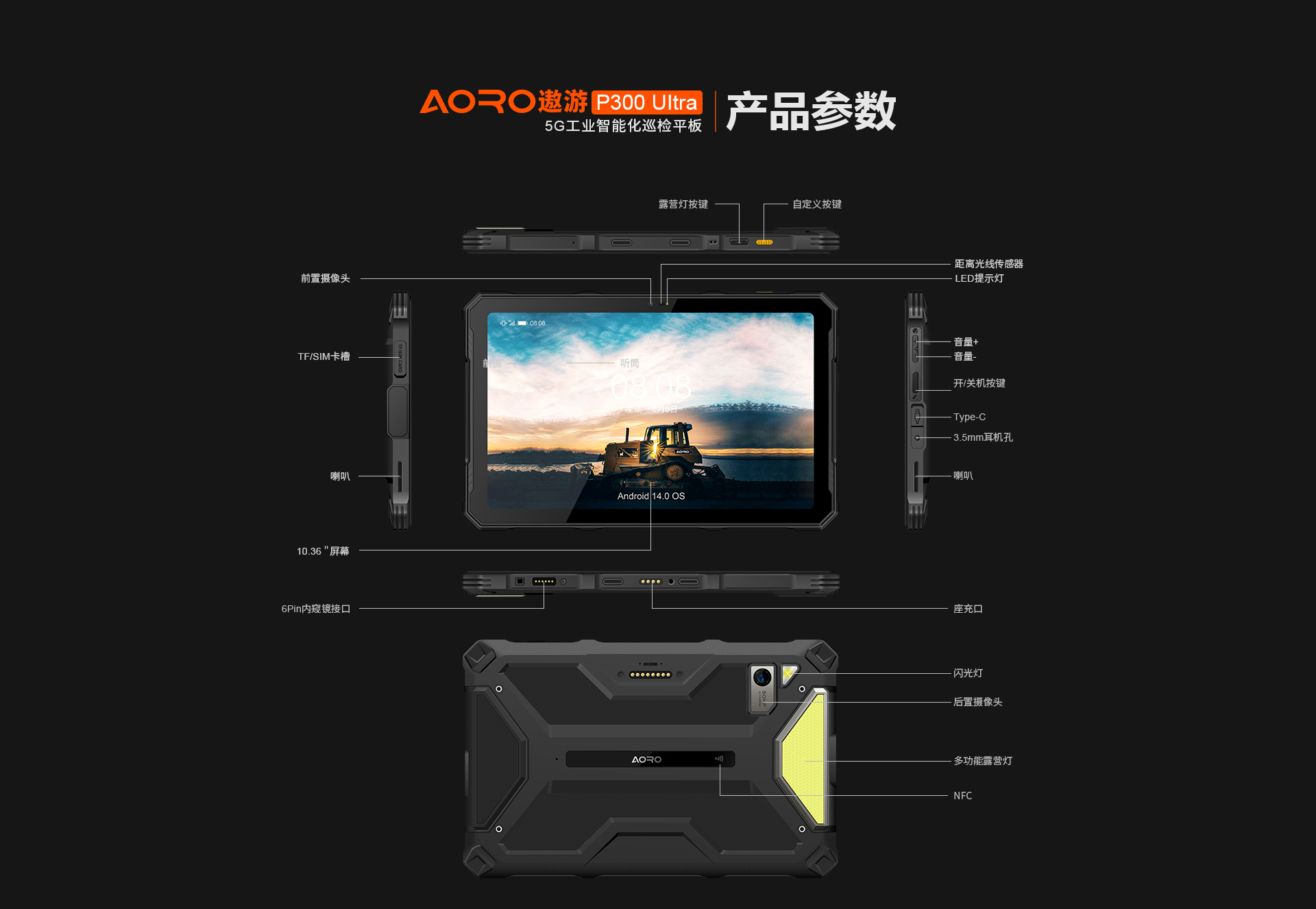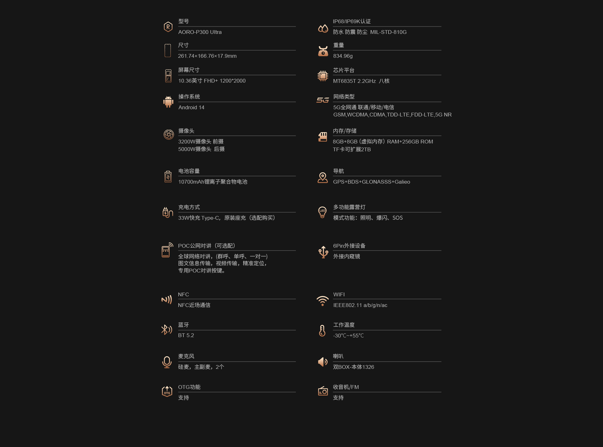 POC公网一键全球对讲 | 5G全网通|电信5G|移动5G|联通5G | 双卡双待 | Android 14系统 | 屏幕英寸 10.36 FHD+ in cell屏 1200*2000 | MT6835T(5G天玑6300) 2.2GHz 八核 机身内存 8GB RAM+8GB(虚拟内存)+256GB ROM | 扩展内存支持(2TB) | 聚合物锂离子电池10700mAh 超长待机 | 前摄3200万 后摄5000万 | IP68/IP69K 防水|防震|防尘认证 | NFC | OTG功能 | 支持内窥镜 | 支持33W快充 | 座充(选配)| 8pin外接扩展音箱(选配)支持露营灯模式:照明、爆闪、SOS