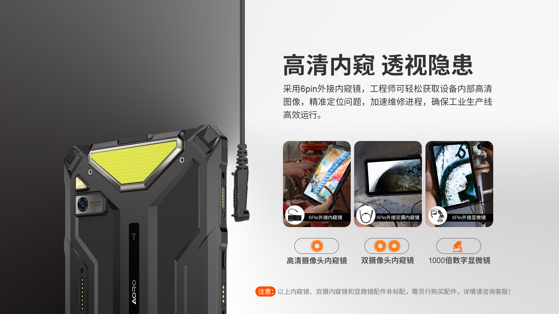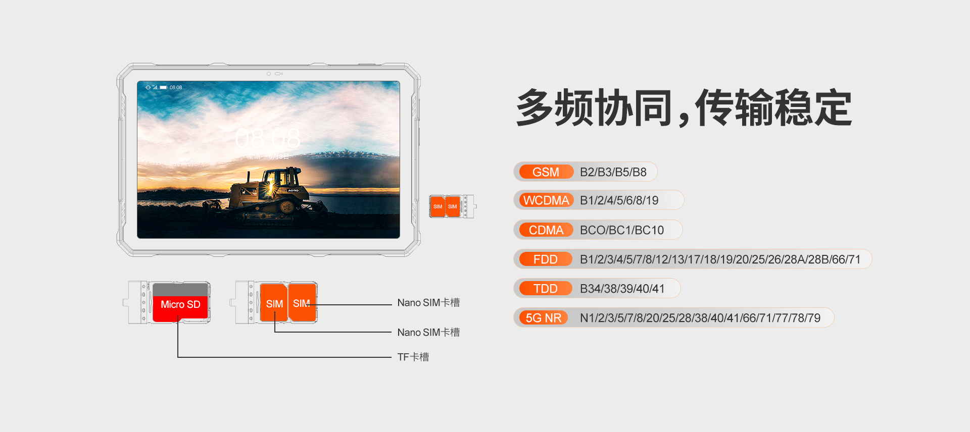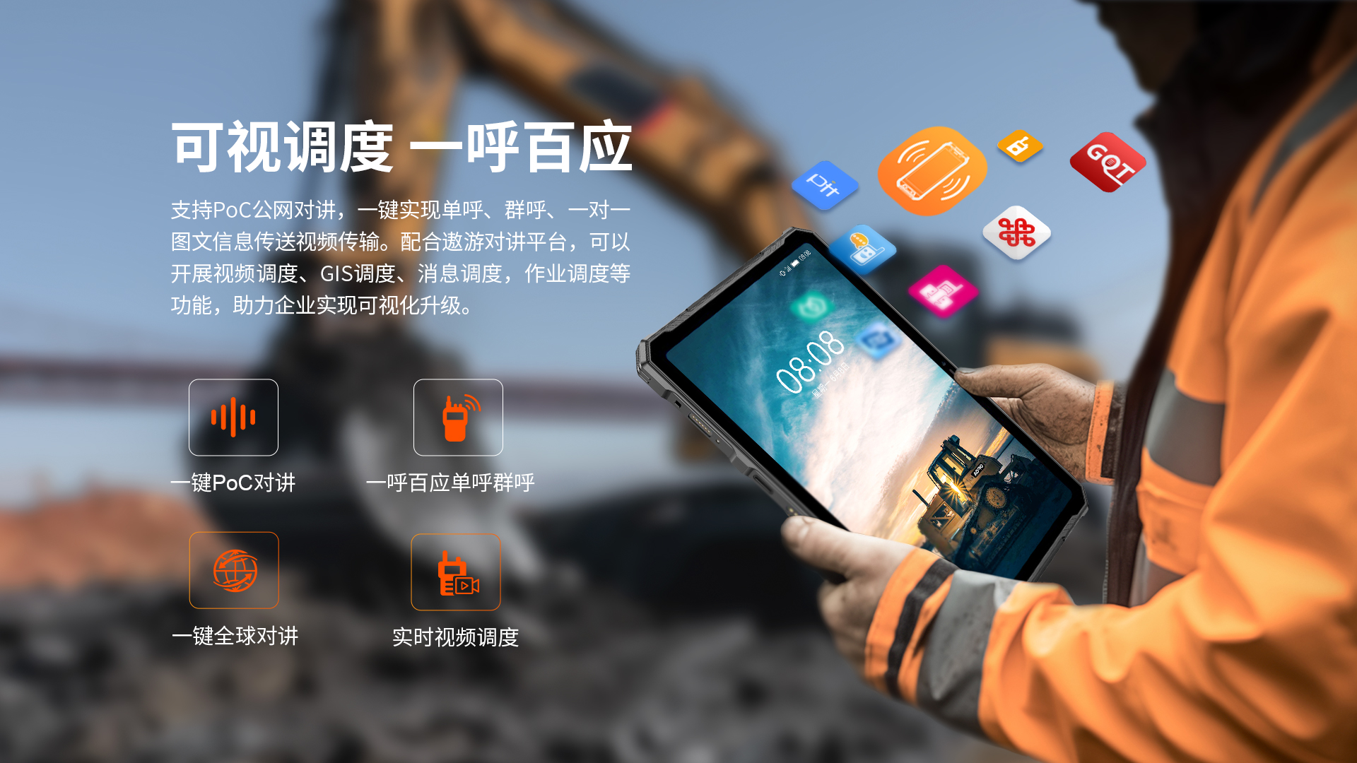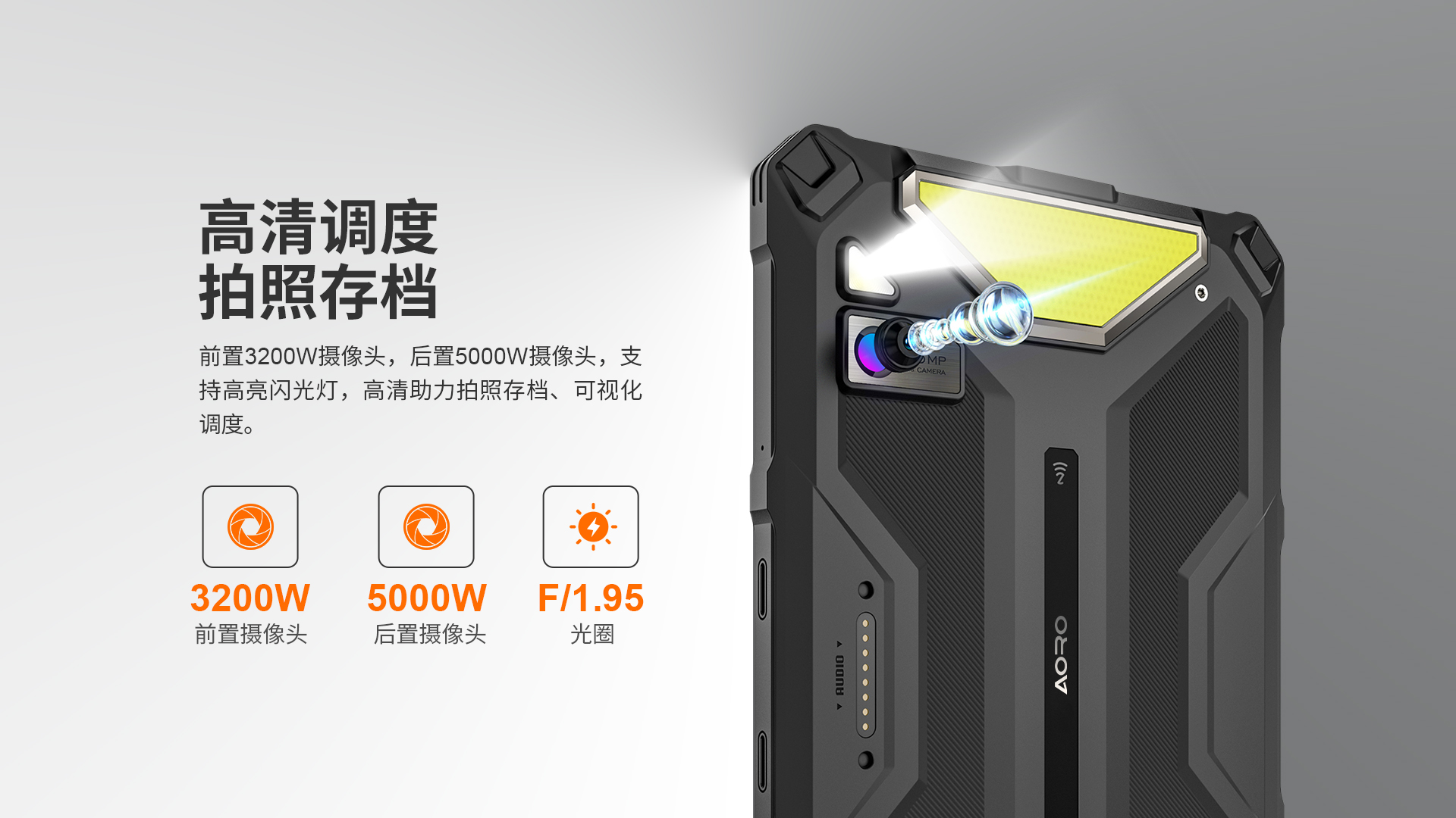 POC公网一键全球对讲 | 5G全网通|电信5G|移动5G|联通5G | 双卡双待 | Android 14系统 | 屏幕英寸 10.36 FHD+ in cell屏 1200*2000 | MT6835T(5G天玑6300) 2.2GHz 八核 机身内存 8GB RAM+8GB(虚拟内存)+256GB ROM | 扩展内存支持(2TB) | 聚合物锂离子电池10700mAh 超长待机 | 前摄3200万 后摄5000万 | IP68/IP69K 防水|防震|防尘认证 | NFC | OTG功能 | 支持内窥镜 | 支持33W快充 | 座充(选配)| 8pin外接扩展音箱(选配)支持露营灯模式:照明、爆闪、SOS