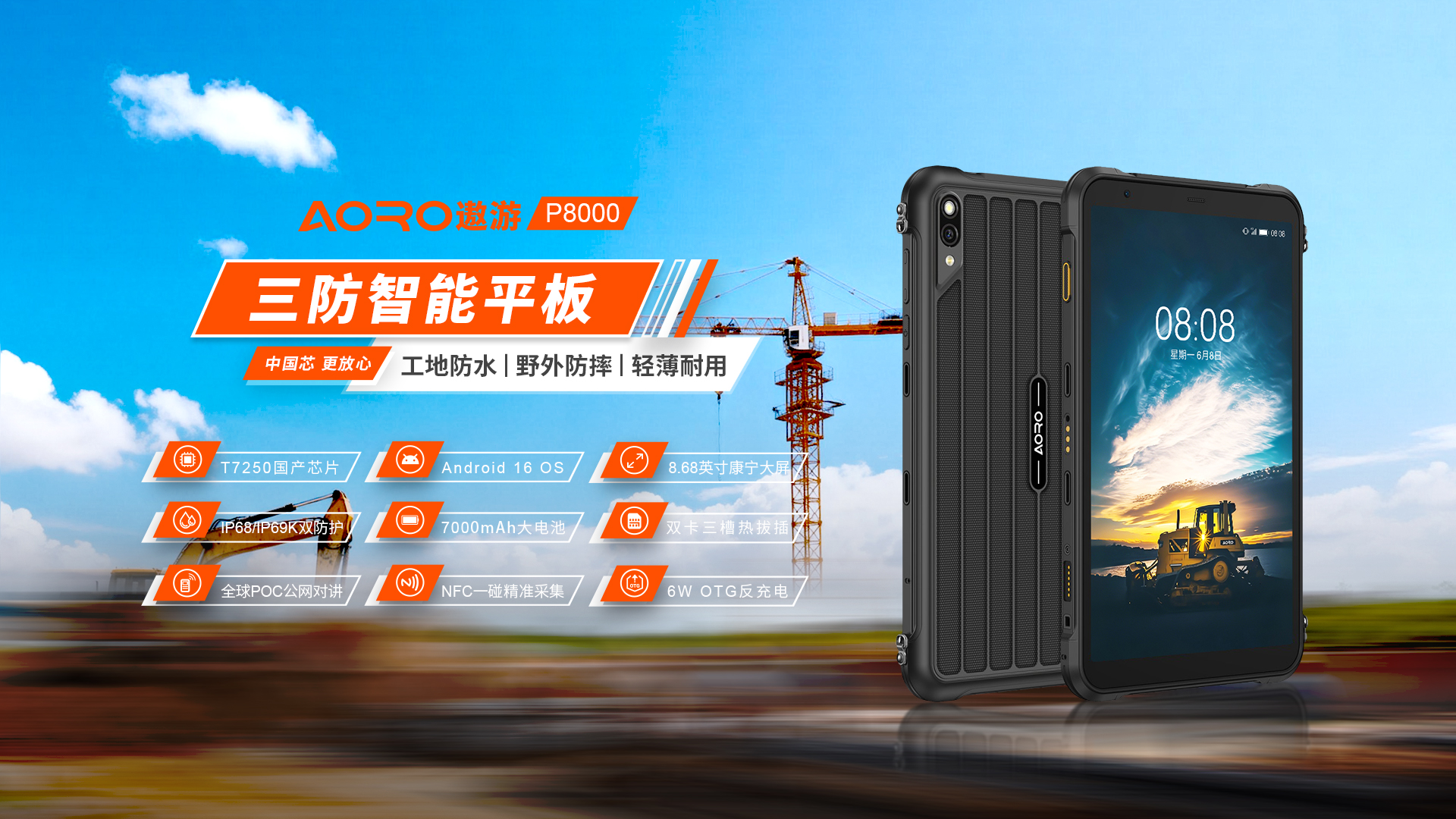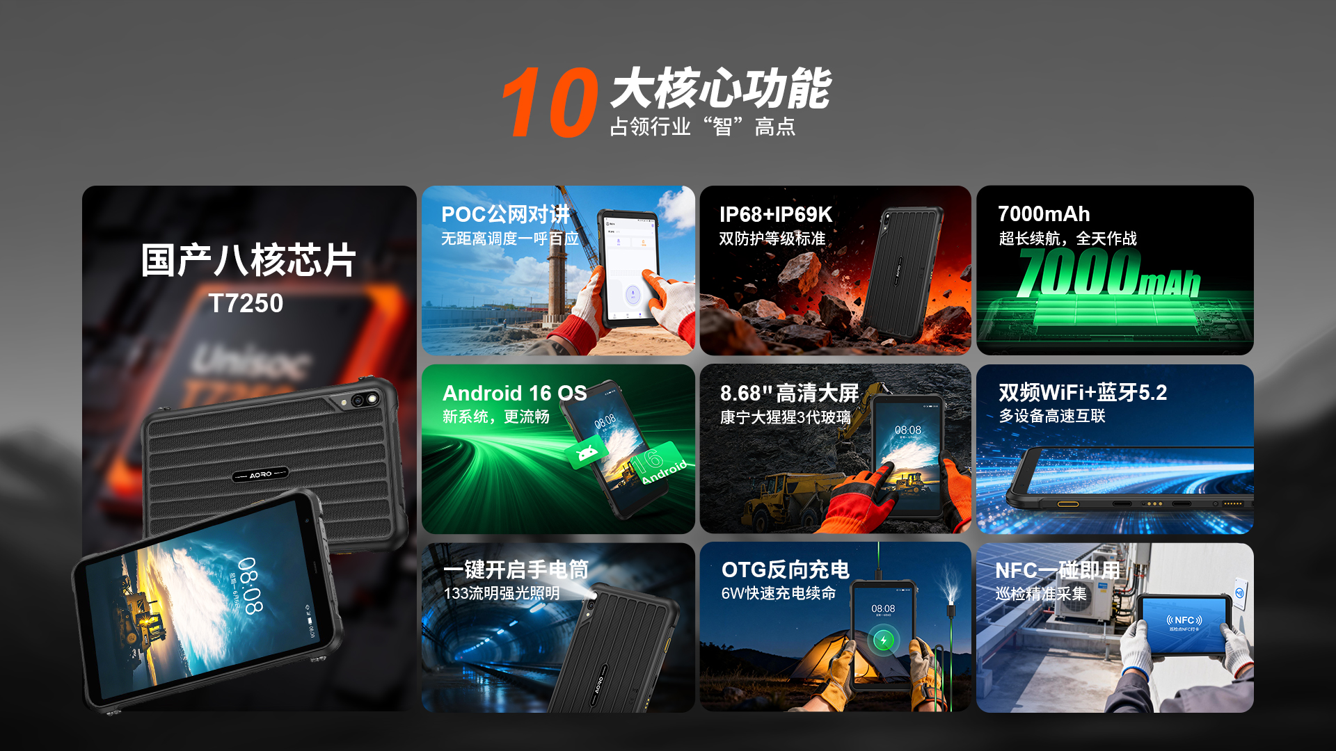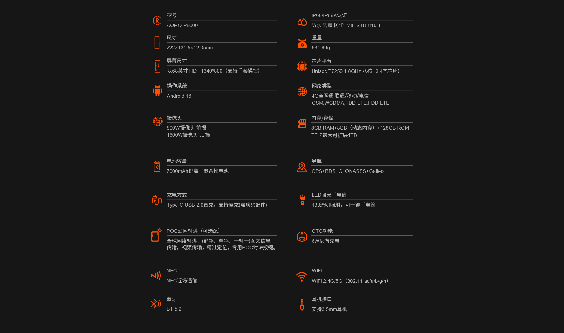POC公网一键全球对讲 | 4G全网通|电信4G|移动4G|联通4G | 双卡双待 三卡槽(支持热插拔) | Android 16系统 | 屏幕8.68英寸 HD+ 1340*800 | 展锐T7250 1.8GHz 八核 国产芯片 | 机身内存 8GB RAM(8GB动态内存)+128GB ROM | 扩展内存支持(1TB) | 聚合物锂离子电池7000mAh 超长待机 | 前摄800万 后摄1600万 | IP68/IP69K双重防护等级 防水|防震|防尘 | NFC | OTG功能 | 支持内窥镜 | Mini手电筒(133流明,一键手电筒)| 蓝牙5.2 | 四模定位GPS+GLONASSS+BDS+Calieo