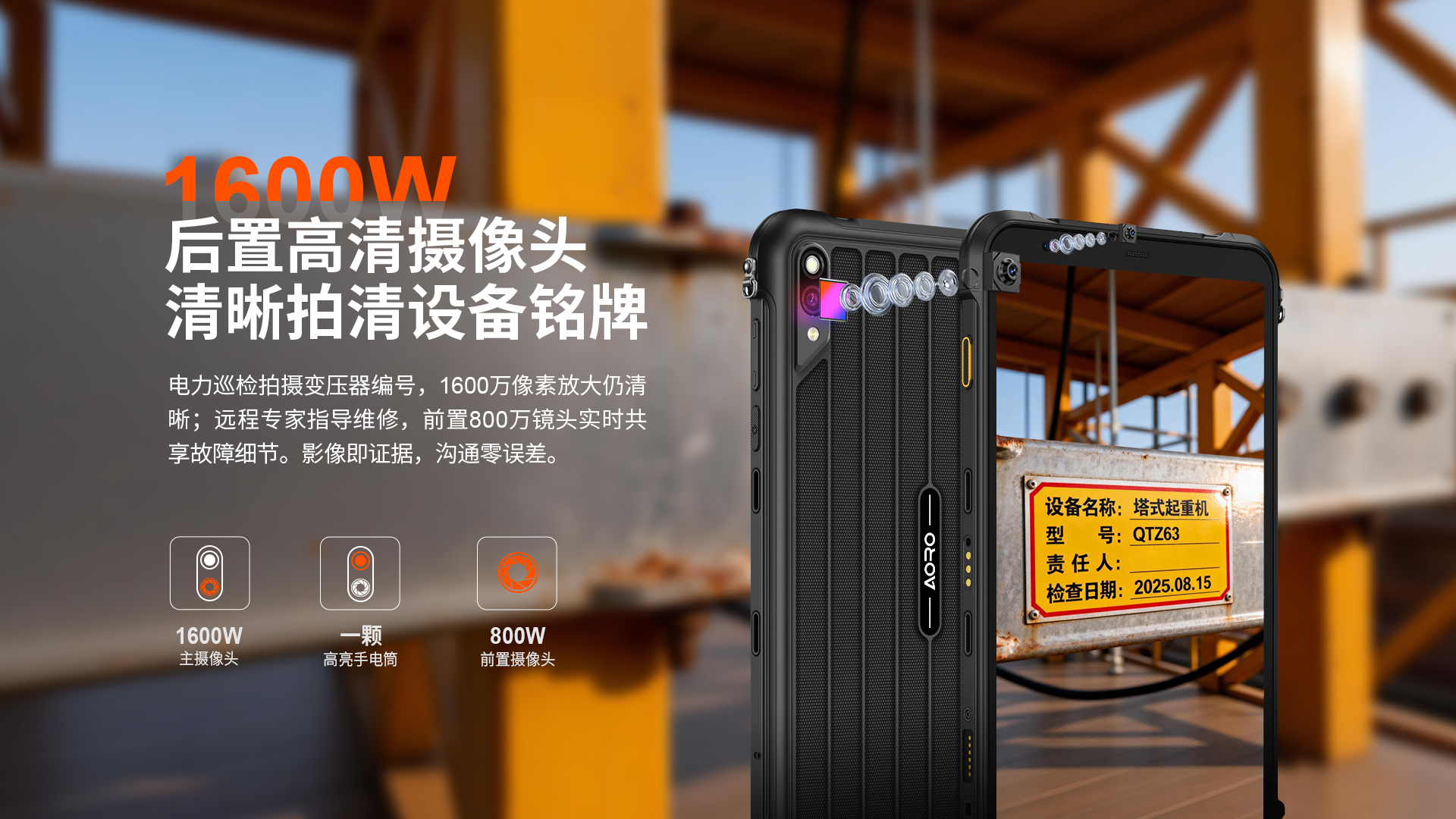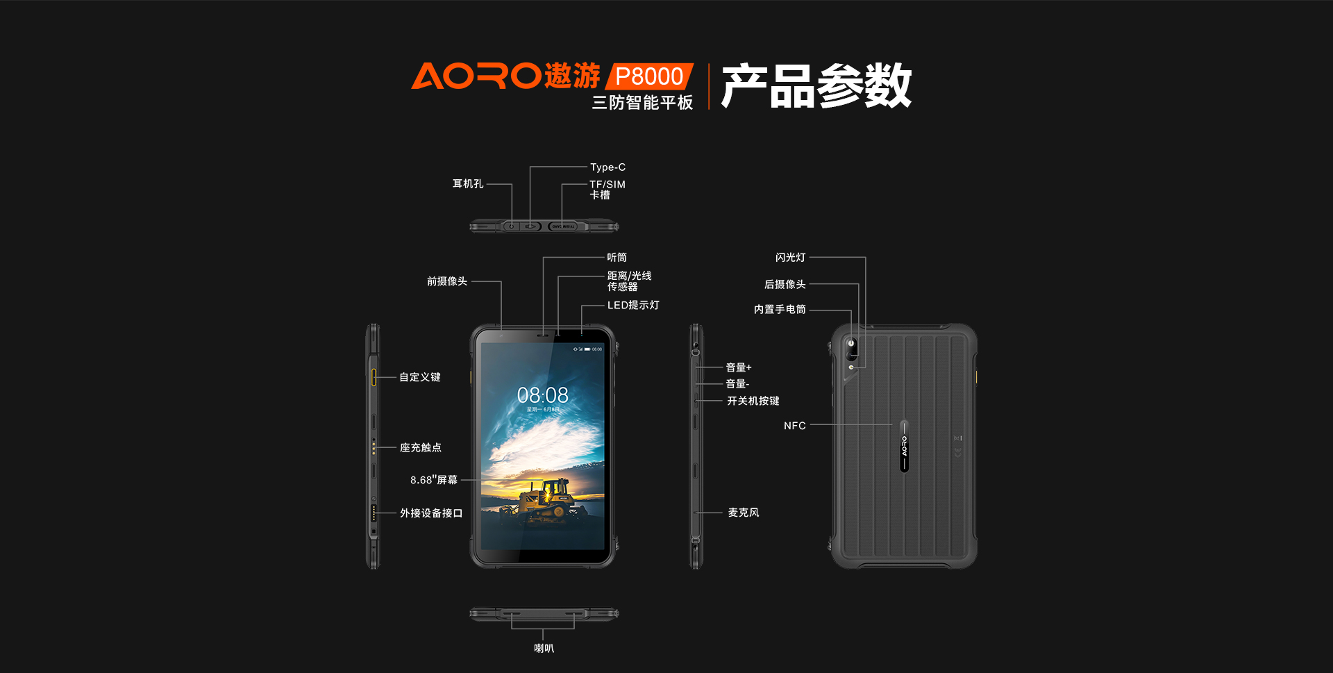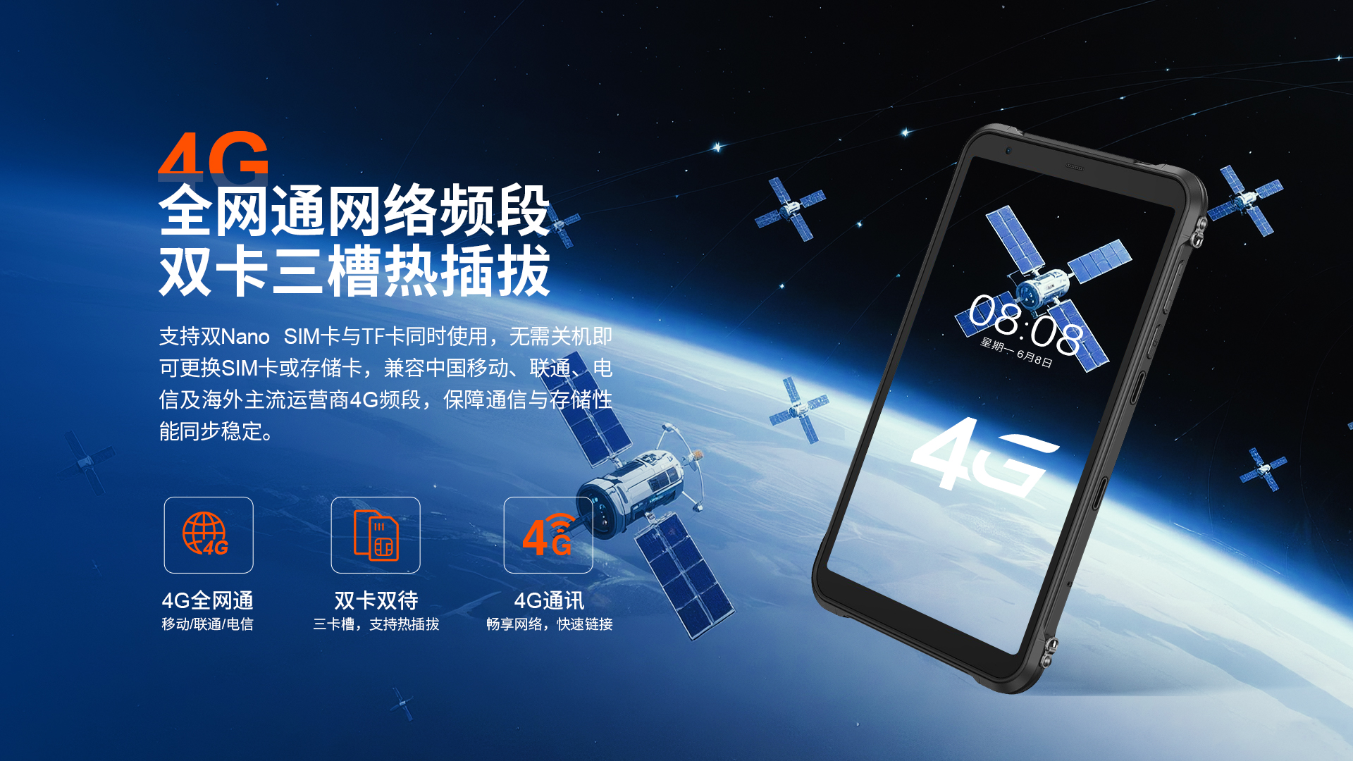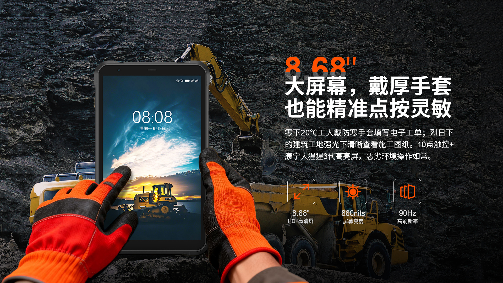 POC公网一键全球对讲 | 4G全网通|电信4G|移动4G|联通4G | 双卡双待 三卡槽(支持热插拔) | Android 16系统 | 屏幕8.68英寸 HD+ 1340*800 | 展锐T7250 1.8GHz 八核 国产芯片 | 机身内存 8GB RAM(8GB动态内存)+128GB ROM | 扩展内存支持(1TB) | 聚合物锂离子电池7000mAh 超长待机 | 前摄800万 后摄1600万 | IP68/IP69K双重防护等级 防水|防震|防尘 | NFC | OTG功能 | 支持内窥镜 | Mini手电筒(133流明,一键手电筒)| 蓝牙5.2 | 四模定位GPS+GLONASSS+BDS+Calieo